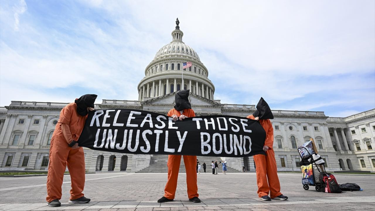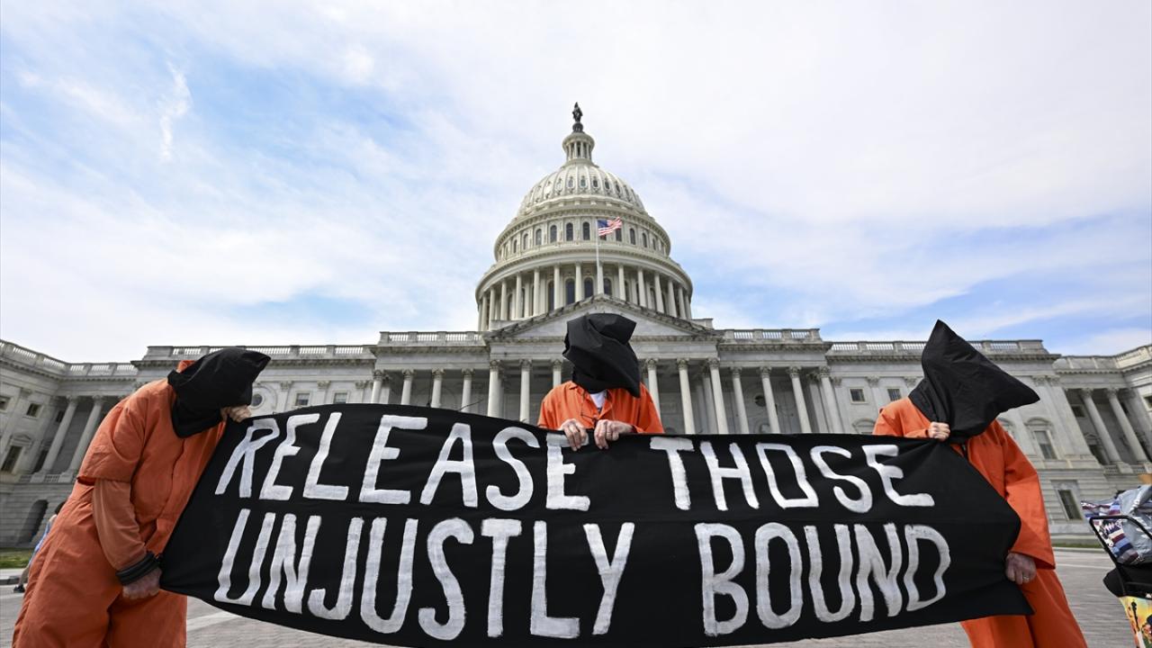 ABD Kongre binasının önünde yapılan eylemde göstericiler “Haksız yere tutulanları serbest bırakın”, “Guantanamo’yu kapatın” yazılı pankartlar açtı.