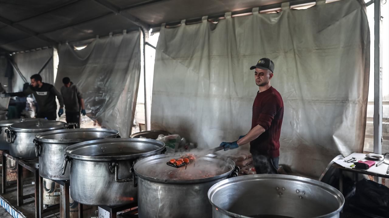 Gönüllüler, kurdukları çadırda yemekleri iftara hazır etmek için canla başla çalışıyor.