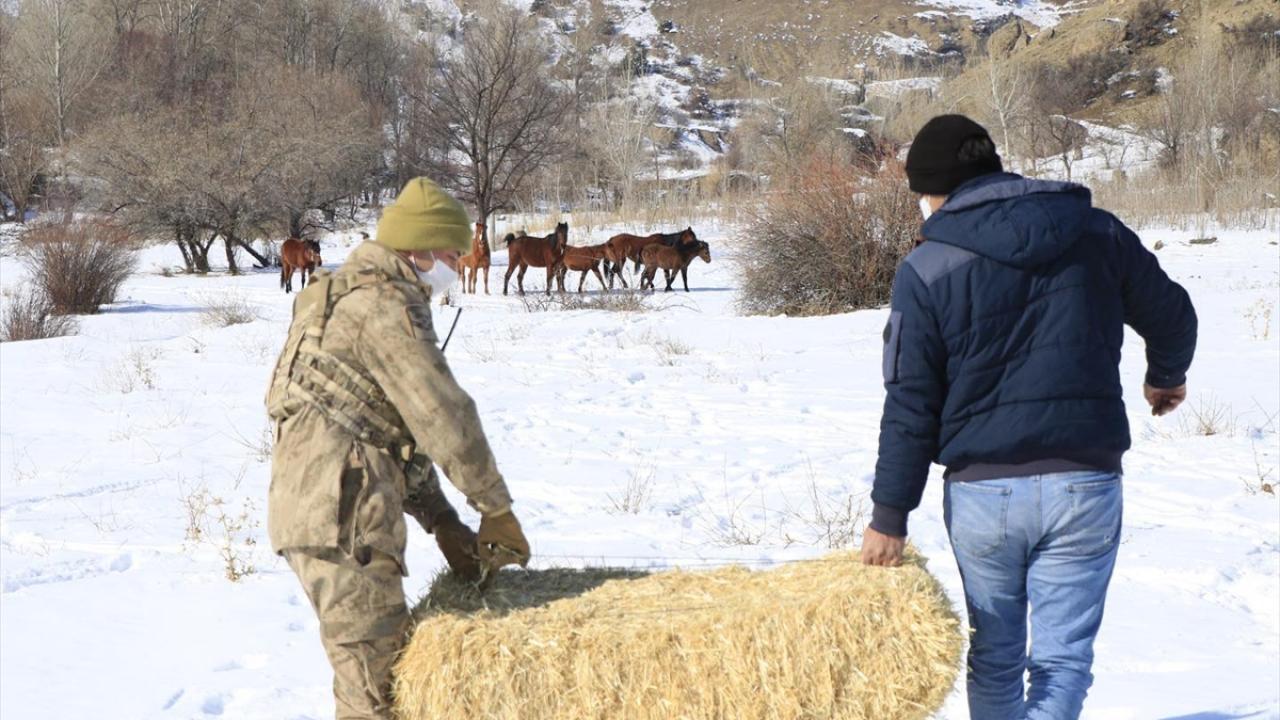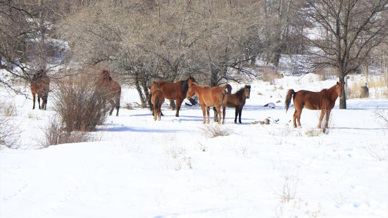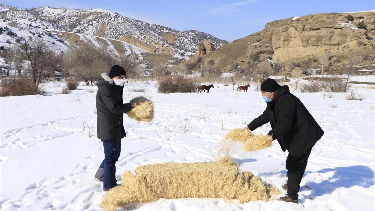Erzincan'da kar kalınlığının bir metreye aştığı Munzur Dağı'ndaki yılkı atları için yaşam alanlarına yem bırakıldı.