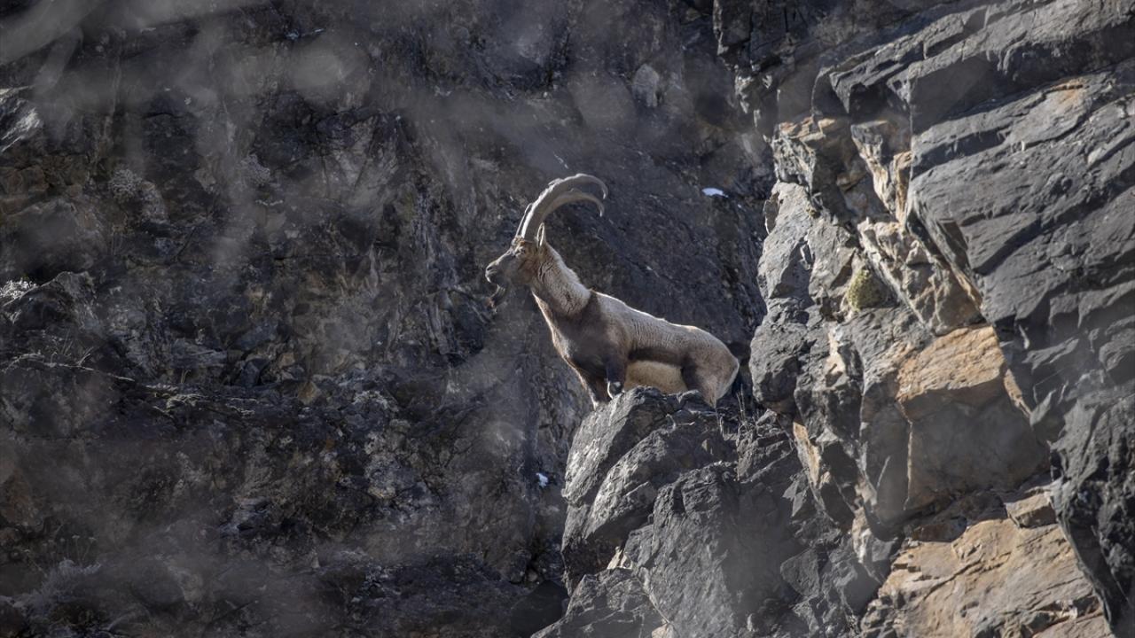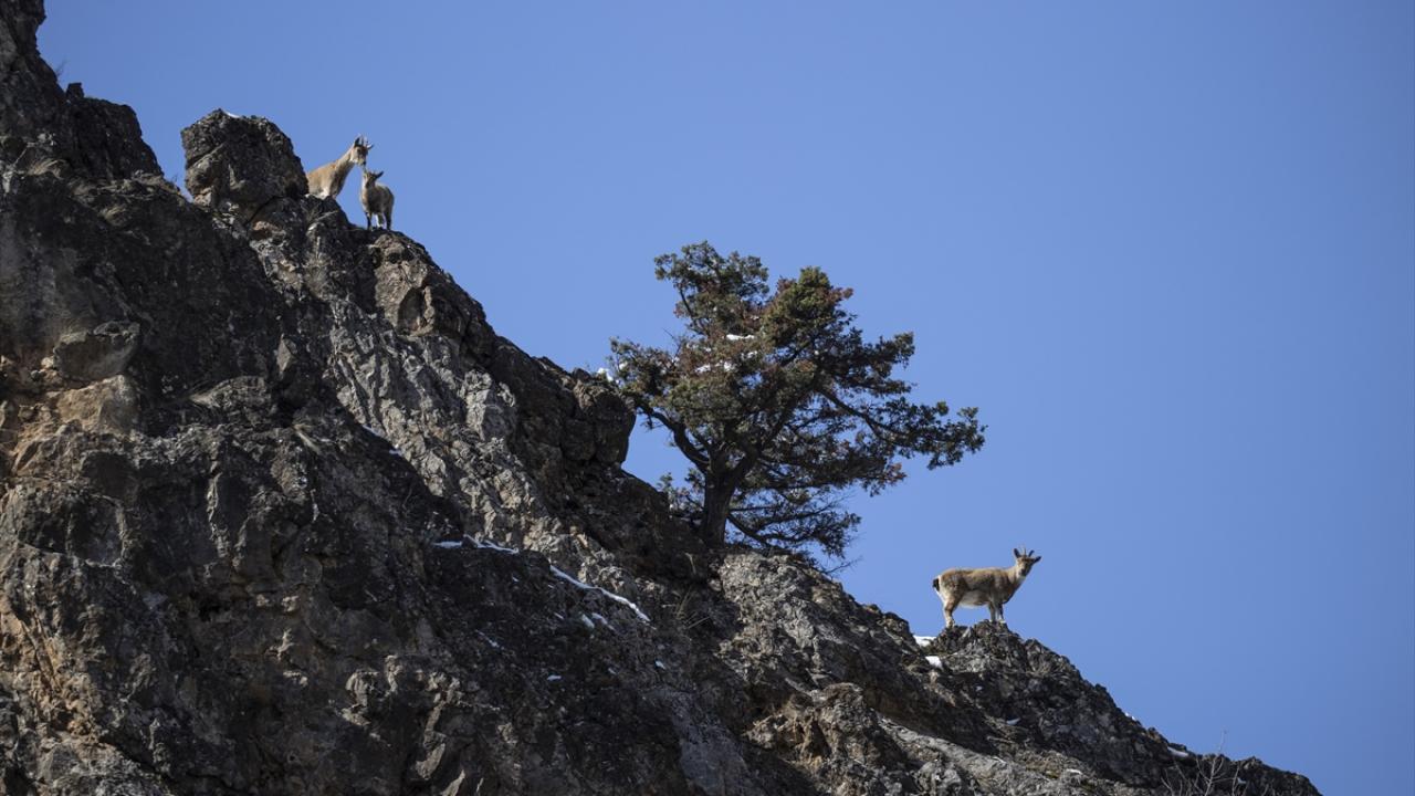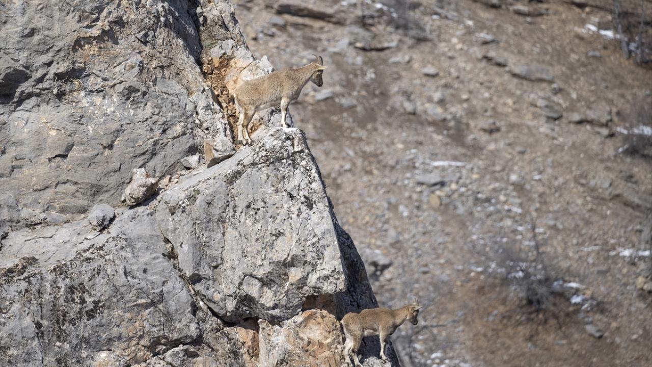 Tunceli'de yaban keçileri, Munzur Vadisi Milli Parkı'nın sarp yamaçlarında yiyecek ararken görüntülendi.