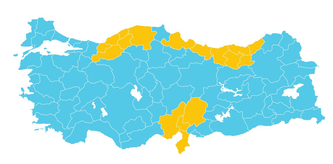 Meteoroloji Genel Müdürlüğünden 17 ile "sarı" kodlu uyarı yapıldı. Vatandaşlardan ani sel, su baskını, yıldırım, yerel dolu yağışı, kıyı kesimlerde hortum riski, yağış anında kuvvetli rüzgar ile kar yağışı görülecek yerlerde buzlanma ve don olayına bağlı ulaşımda aksama gibi olumsuzluklara karşı dikkatli ve tedbirli olmaları istendi.