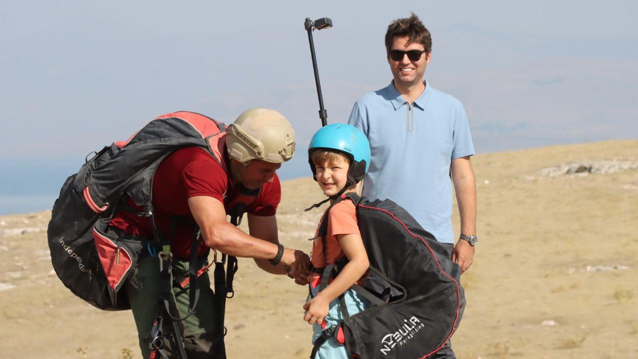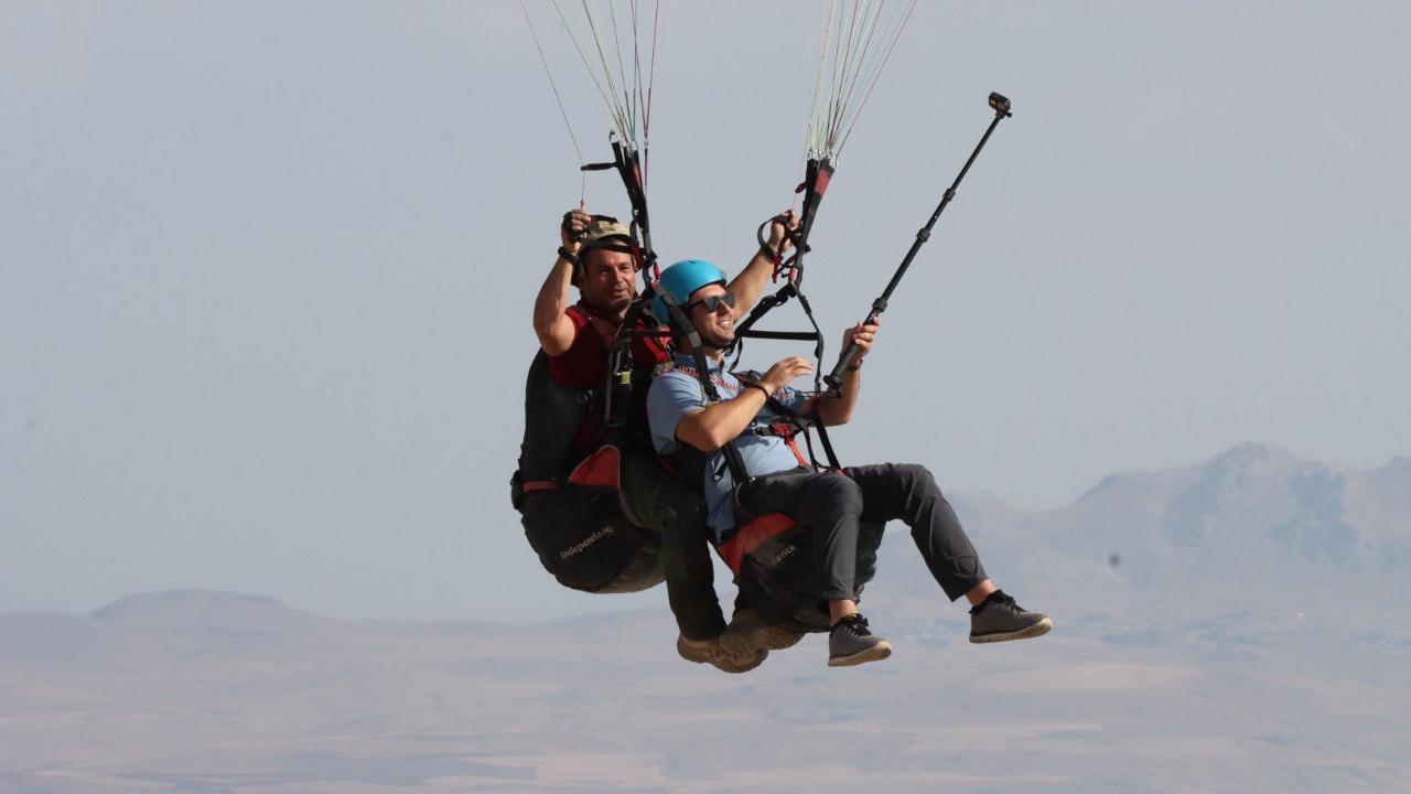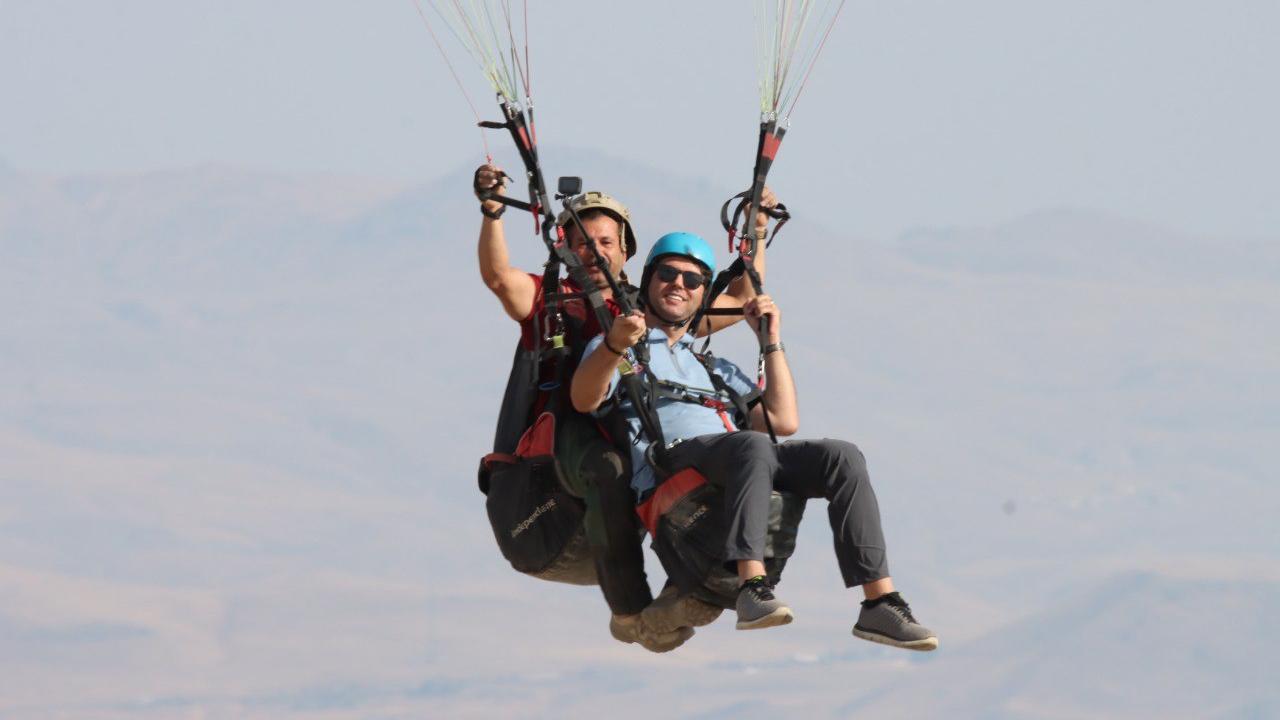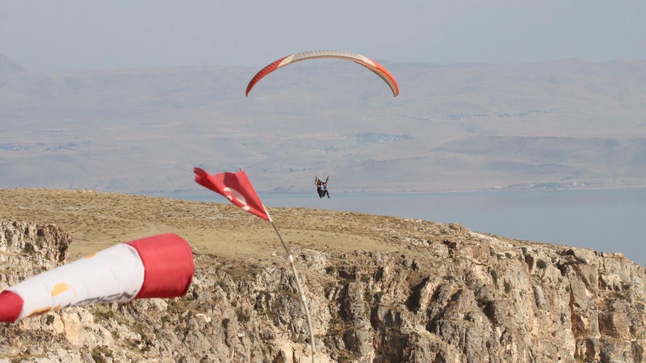 Burada hazırlıklarını yapan Karaloğlu ve sporcular, yaptıkları uçuşla metrelerce yükseklikten Van Gölü`nün ilçenin güzellikleriyle bütünleşen manzarasını görme fırsatı buldu.
