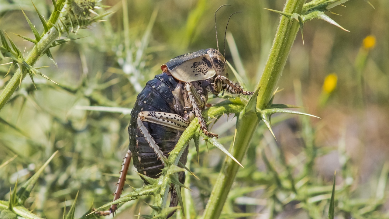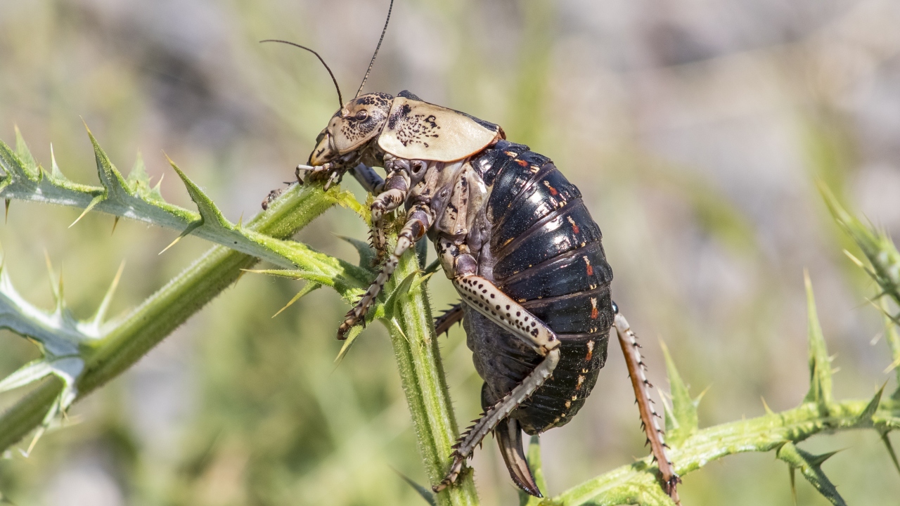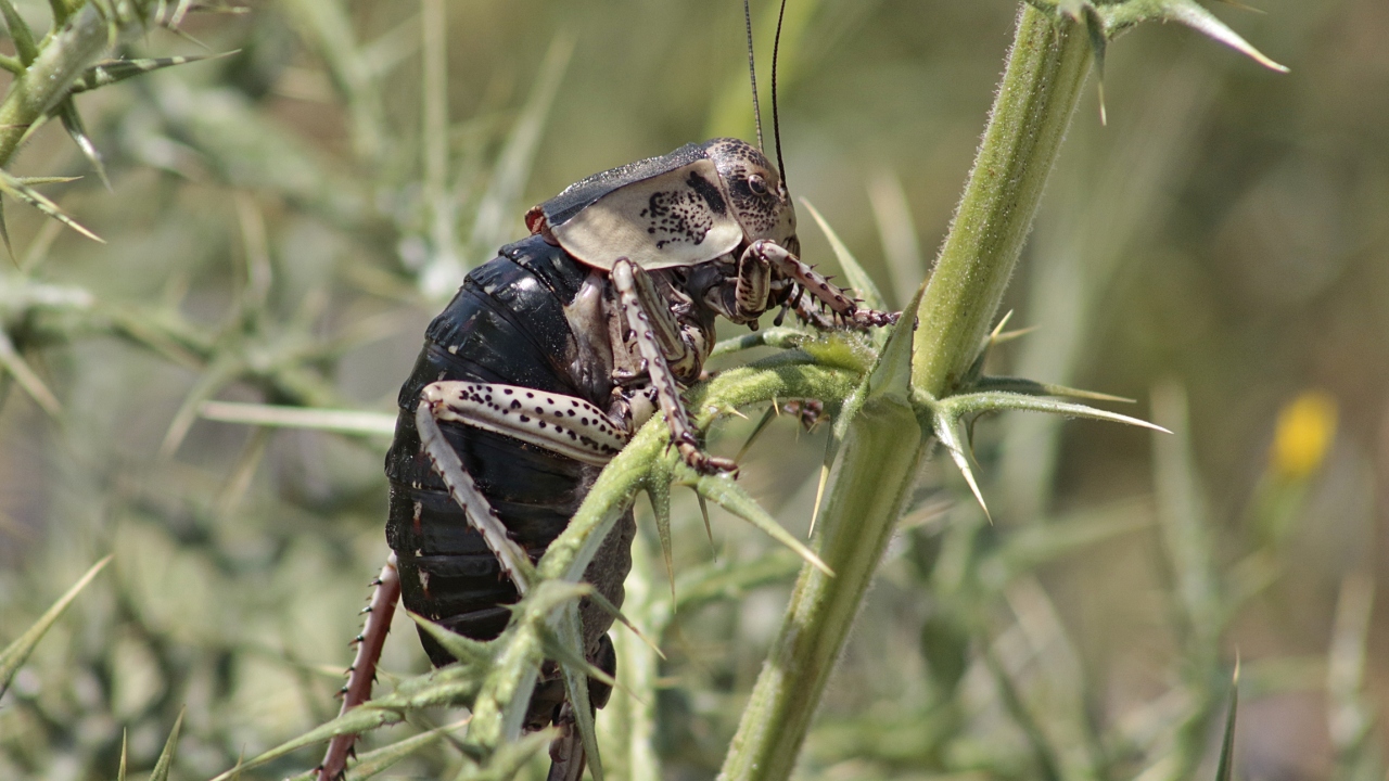Dünyada sadece Güneydoğu Anadolu Bölgesi'nde yaşayan tombul çekirge (Bradyporus) yumurtasını daha kaliteli hale getirmek için erkeğini yerken, sönmüş volkanik Karacadağ eteklerinde görüntülendi.