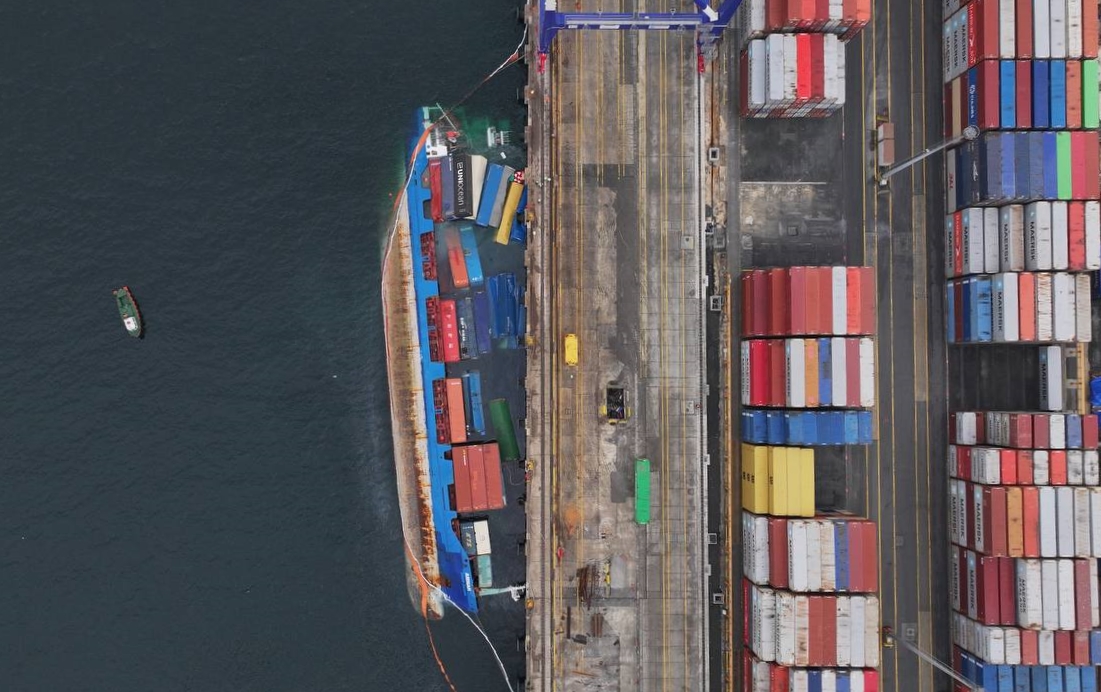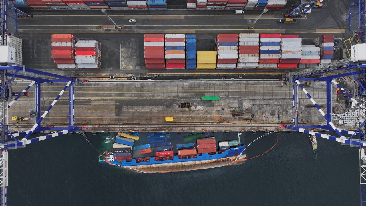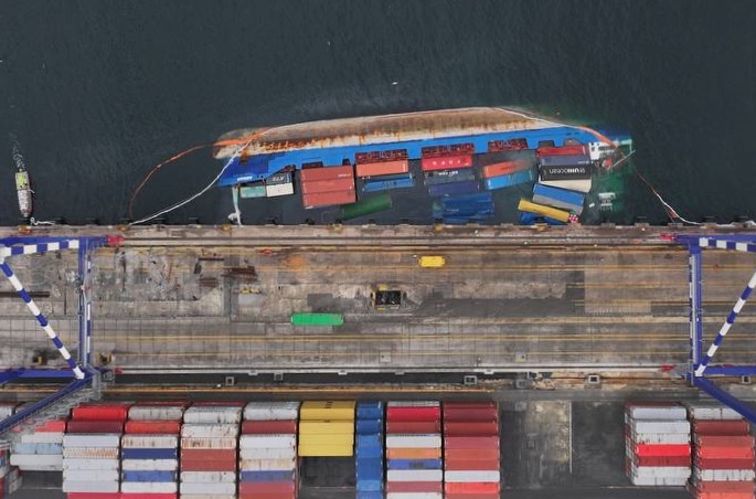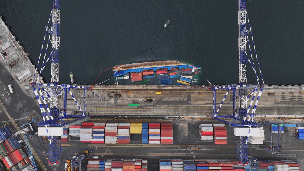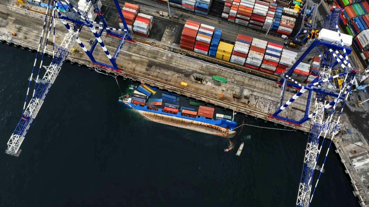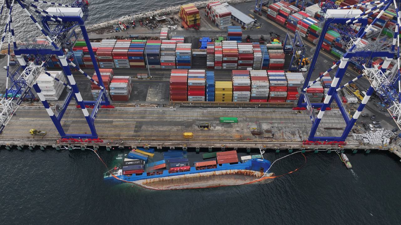 Ambarlı Marport Limanı'nda yan yatan Comoros bayraklı AMNAH isimli konteyner gemisindeki 15 personel tahliye edildi. Devrilen konteyner gemisi havadan görüntülendi.