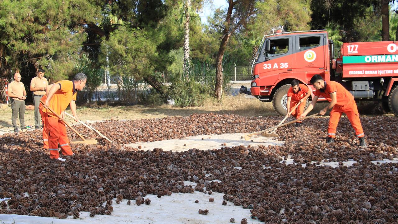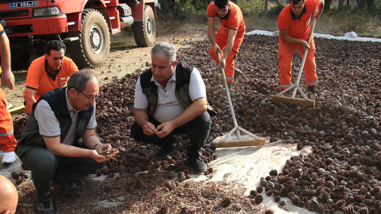 Yapılan çalışma ile ilgili bilgi veren Orman Bölge Müdürü Mustafa Yalçın, "Gençleştirme sahalarımız ve maalesef bizi üzen orman yangınlarında ihtiyaç duyulan tohum takviyesi sağlamak için kızılçam tohumu üretimi yapıyoruz. Bu kızılçam kozalaklarımızı tohum için öngördüğümüz alanlardan temin ediyoruz. Daha sonra kozalak tohum çıkarma pistleri diye ifade ettiğimiz bu pistlere bunları belirli bir kalınlıkta seriyoruz. Sıcakların artmasıyla birlikte zaman zaman karıştırılarak tohumun karpellerden ayrılması ve dökülmesi işlemini sağlıyoruz. Ardından tohumlar alınarak çuvallara konuluyor ve kullanılacak, tohum takviyesi yapılacak alanlara uygun zamanda transfer edilerek sahada ekimi sağlanıyor. Böylece hem doğal gençleştirme tabi gençleştirme sahalarımız için gerekli olan tohumu temin etmiş oluyoruz, hem de yanan alanlarımızda tohumla ekim yöntemiyle kullanacağımız tohumları temin etmiş oluyoruz" dedi.