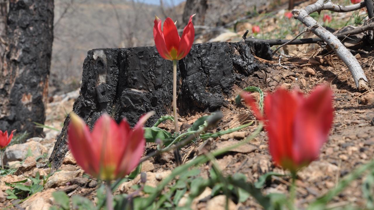 Bölgede yangın sonrası ilk defa görülen endemik bitki dağ laleleri doğa severlerin ve fotoğraf tutkunlarının da ilgisini çekiyor.