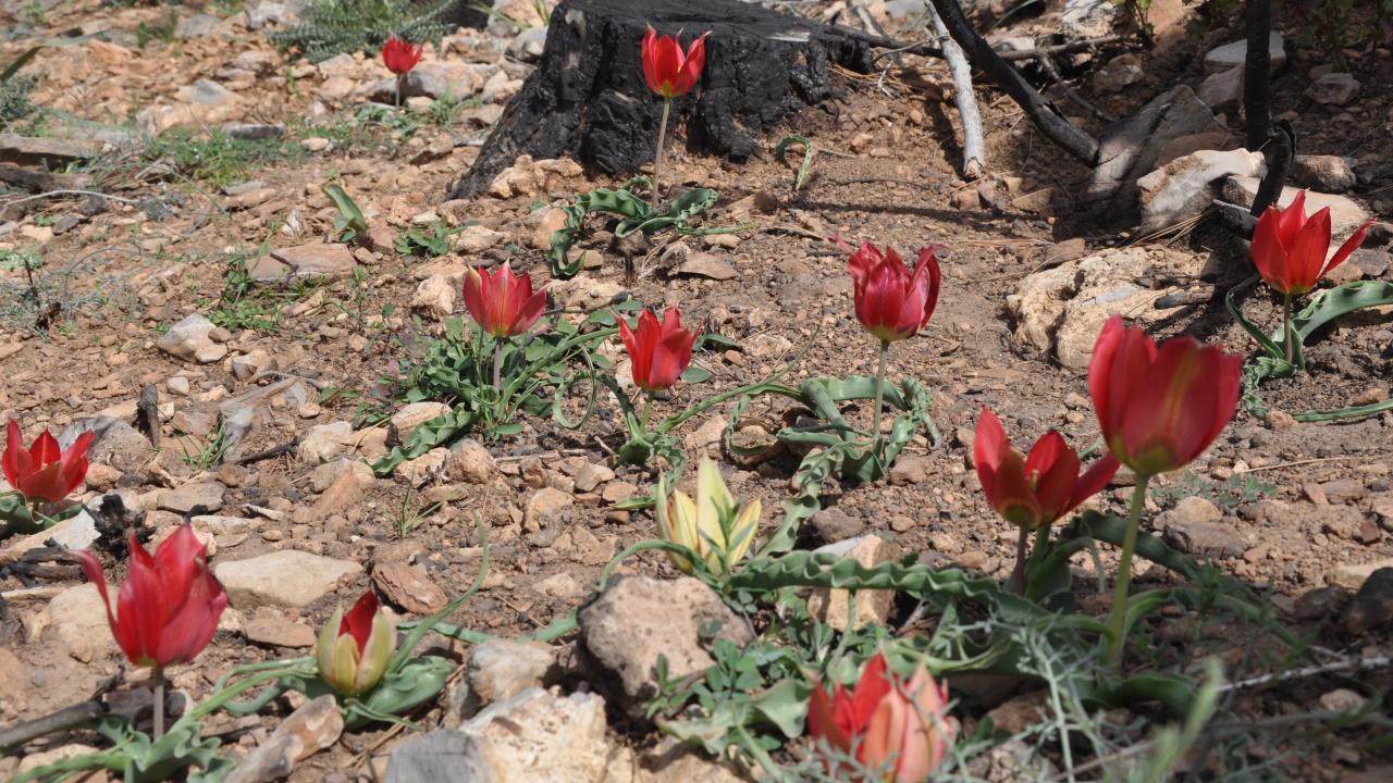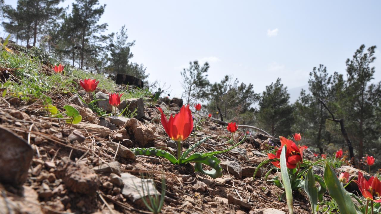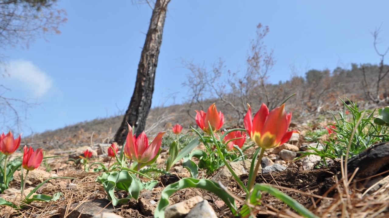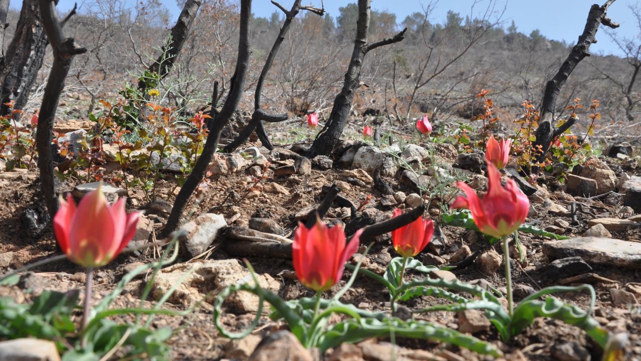Mersin’in Silifke ilçesinde 29 Temmuz 2021 tarihinde çıkan orman yangınında zarar gören alanlar tohum ekme ve fidan dikme projeleri ile yeşillendirilirken, bir yandan da doğal olarak yetişen ve endemik bitki olan dağ laleleri (Tulipa armena) ile renklenmeye başladı.