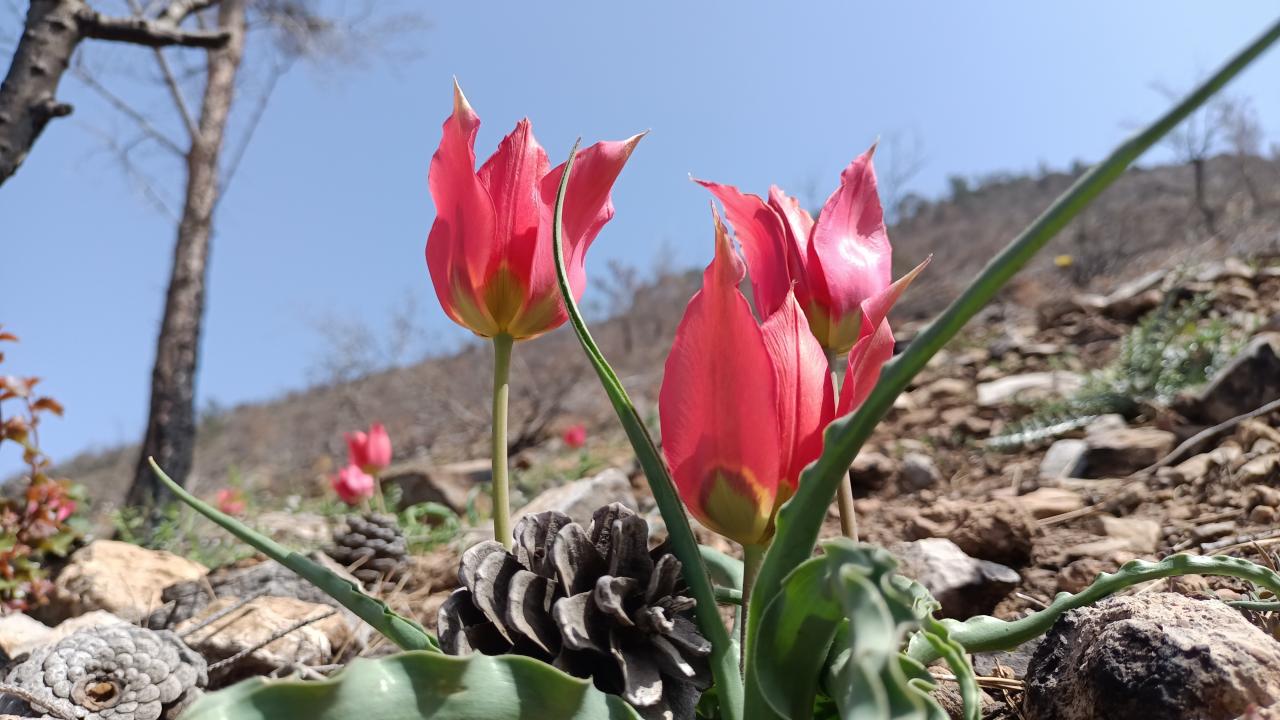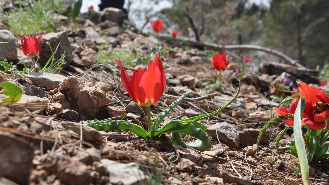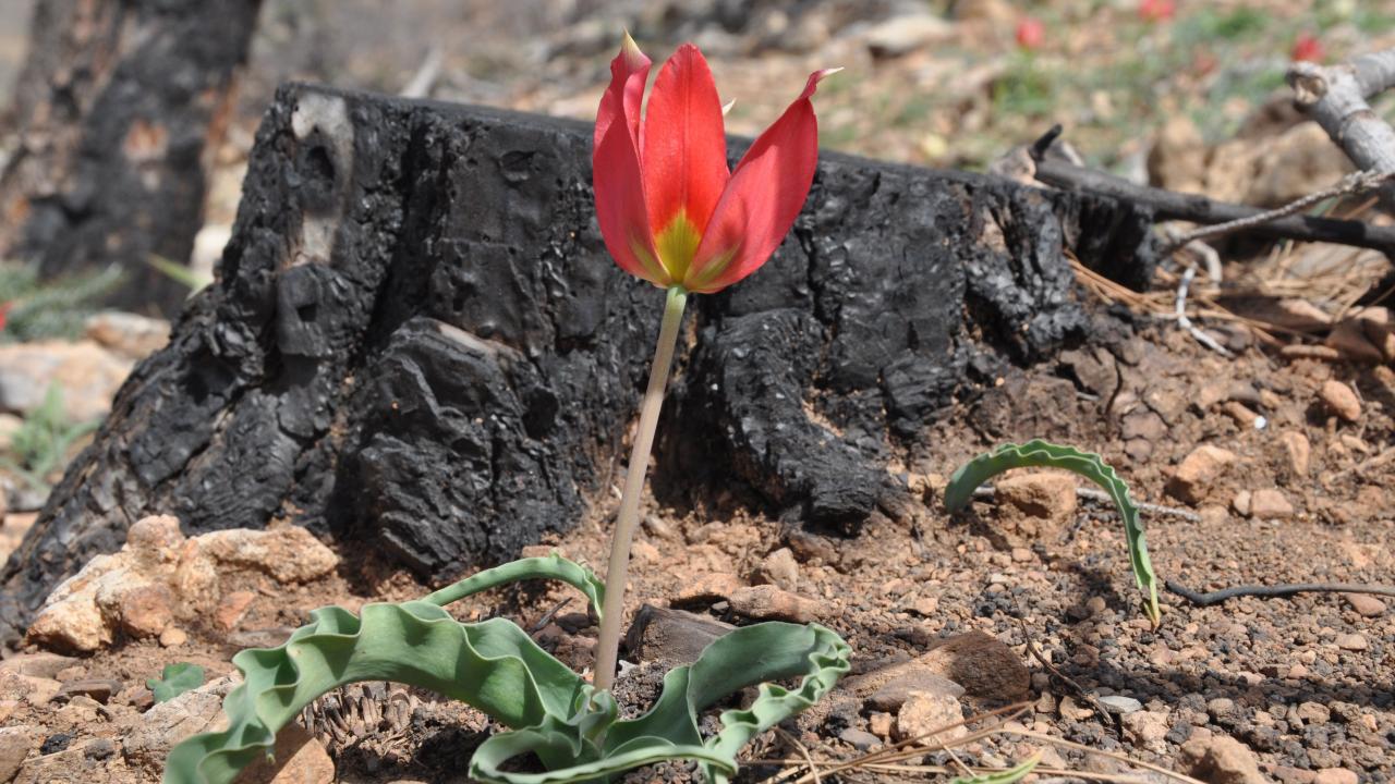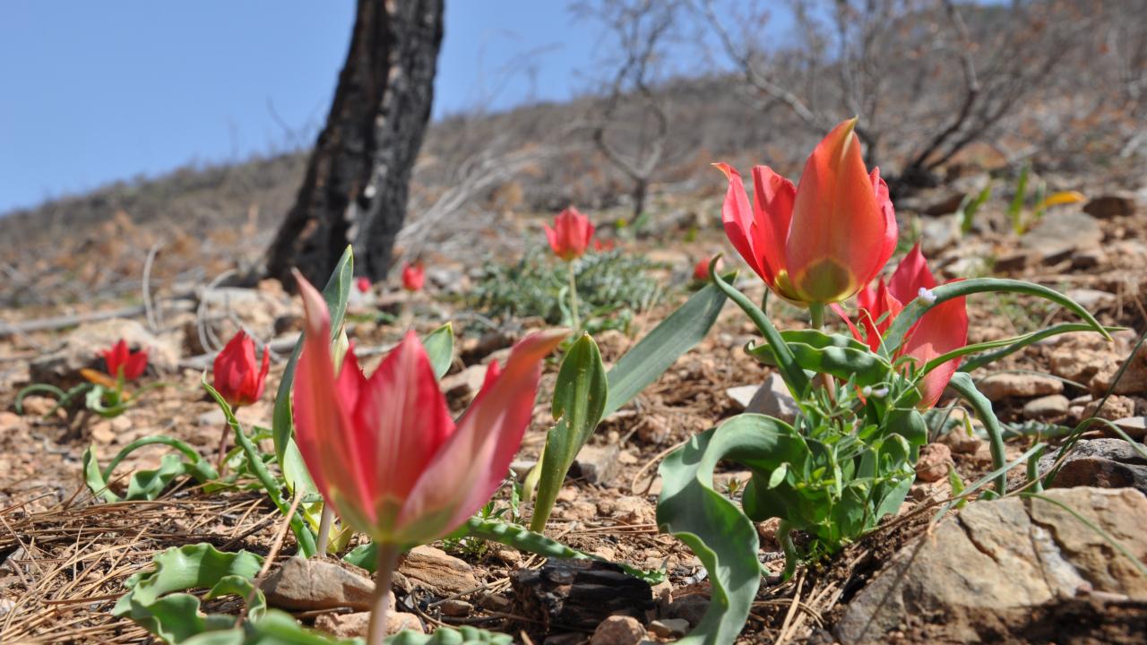 Mersin’in Silifke ilçesinde 29 Temmuz 2021 tarihinde çıkan orman yangınında zarar gören alanlar tohum ekme ve fidan dikme projeleri ile yeşillendirilirken, bir yandan da doğal olarak yetişen ve endemik bitki olan dağ laleleri (Tulipa armena) ile renklenmeye başladı.