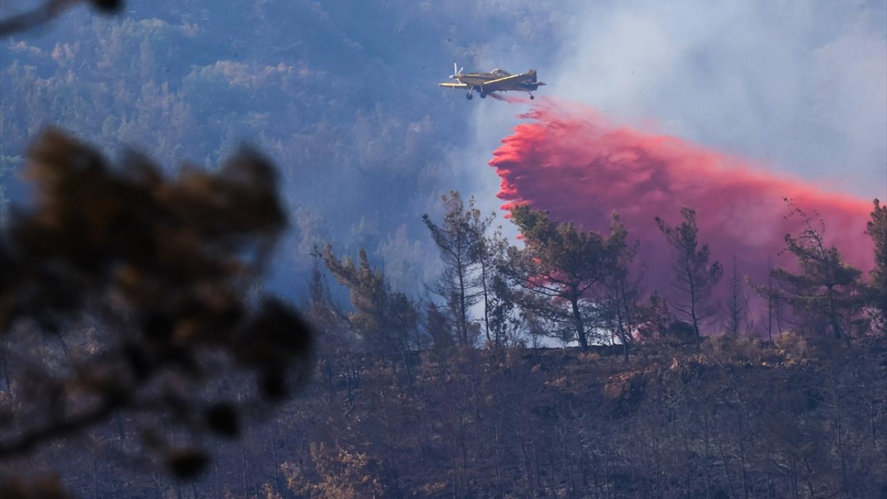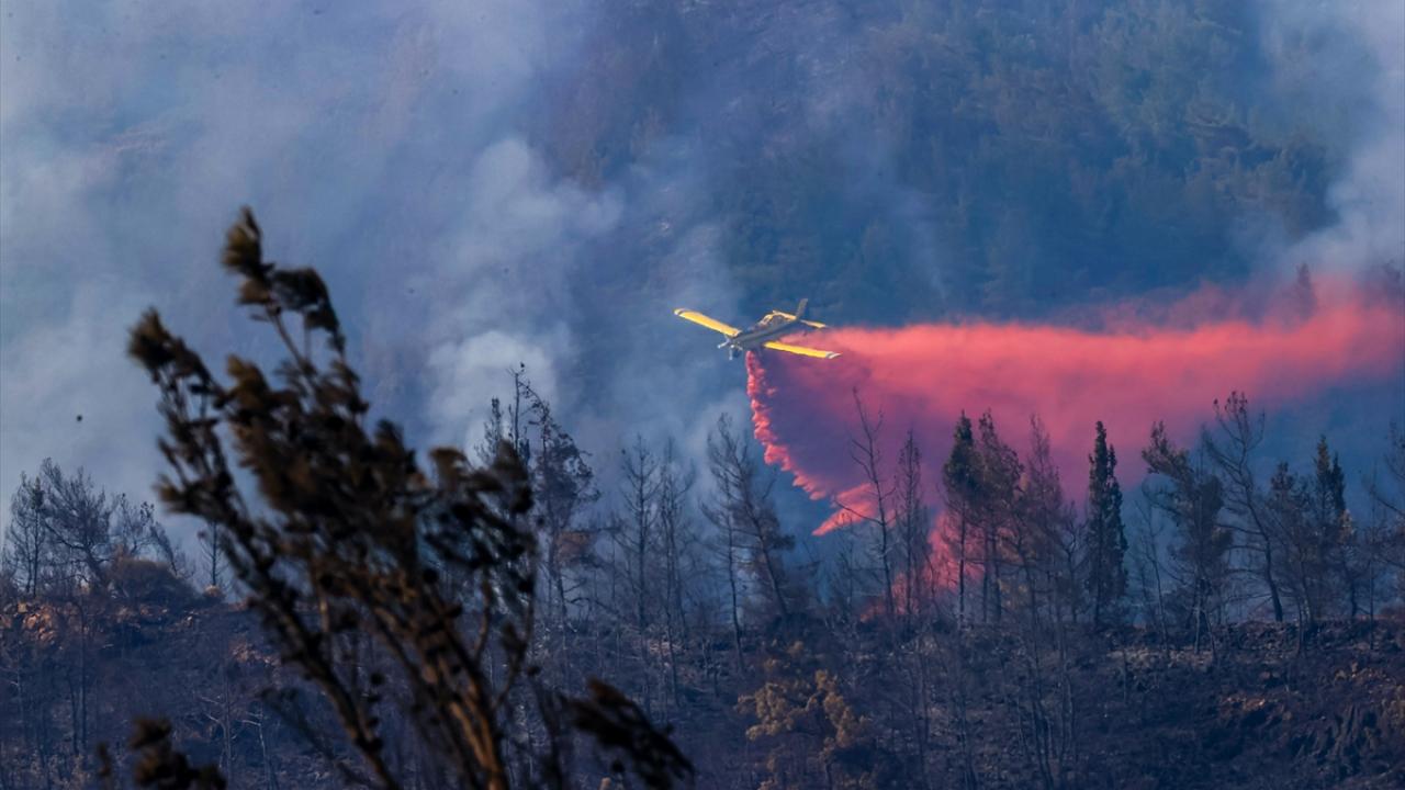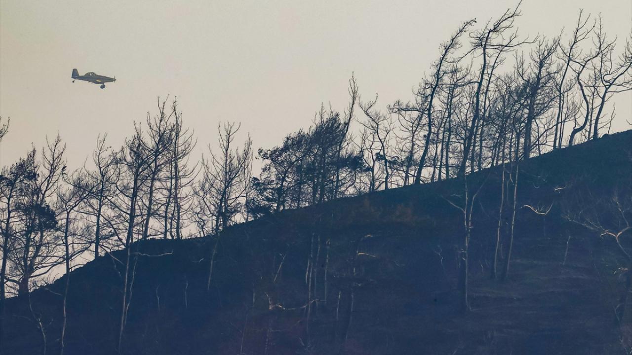 Ekiplerin söndürmek için yoğun bir şekilde çalıştığı orman yangını, gazeteciler tarafından polis helikopteri ile havadan kaydedildi.