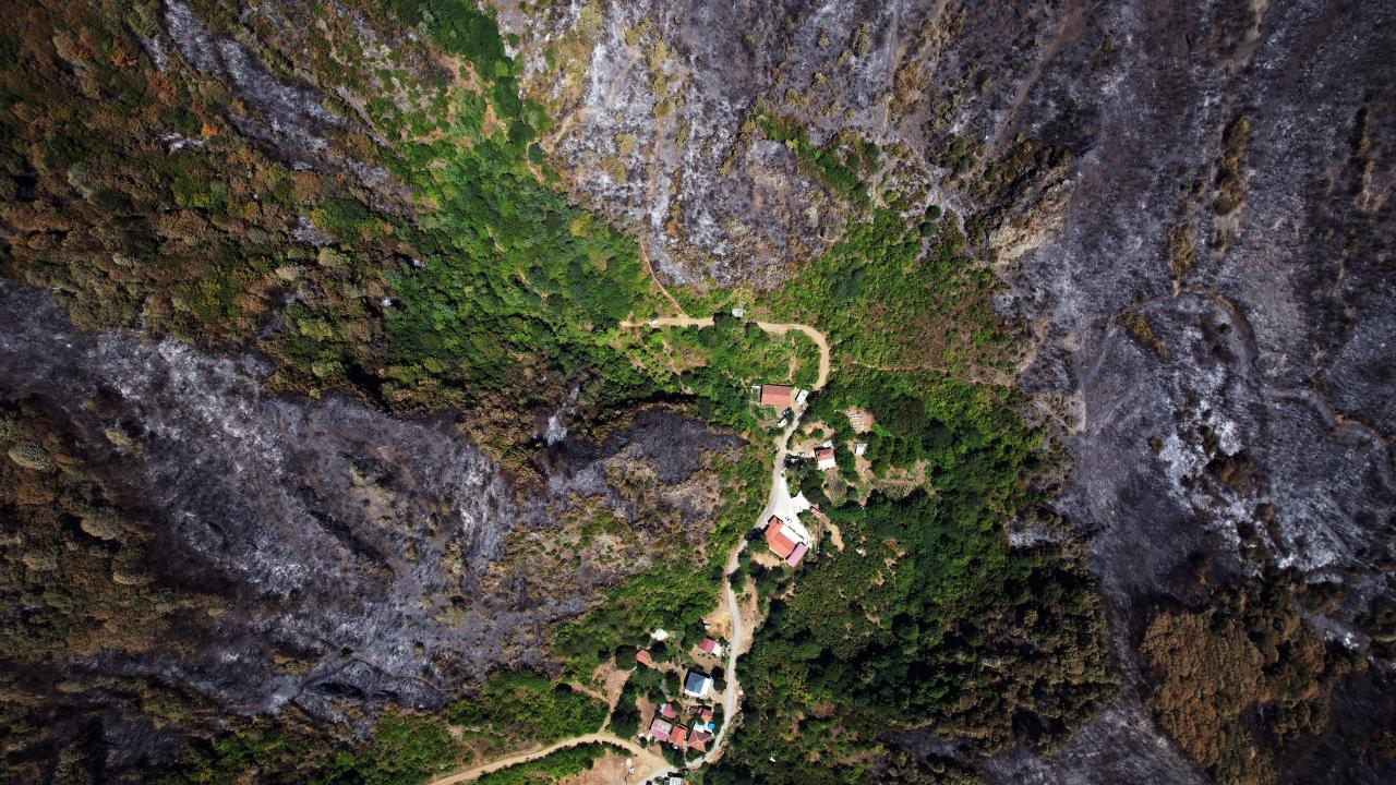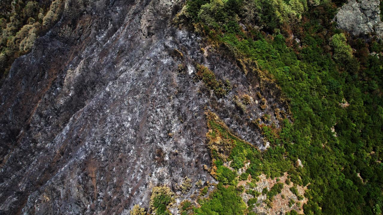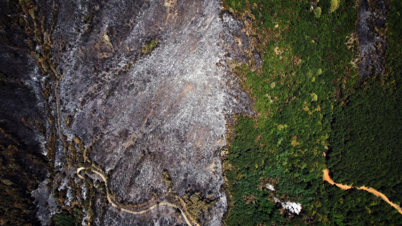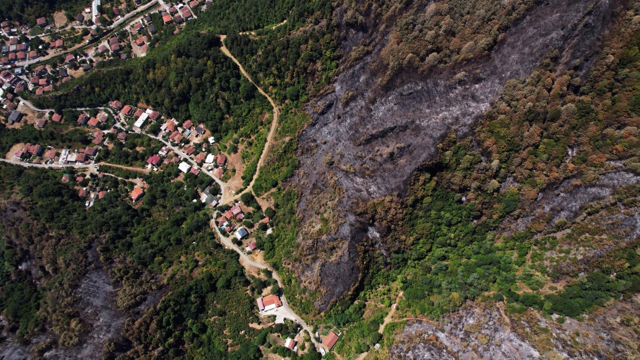 Yangının söndürülmesinden iki gün sonra verilen hasar da gözler önüne serildi. Bir tarafta yeşilin, diğer tarafta siyahın tonlarının olduğu alan havadan görüntülendi.