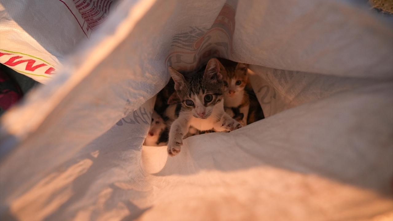 Yoğun dumana rağmen yavru kedi ve köpeklerin bulunduğu eve giren ekipler, hayvanları çuvallar aracılığıyla dışarı çıkardı.