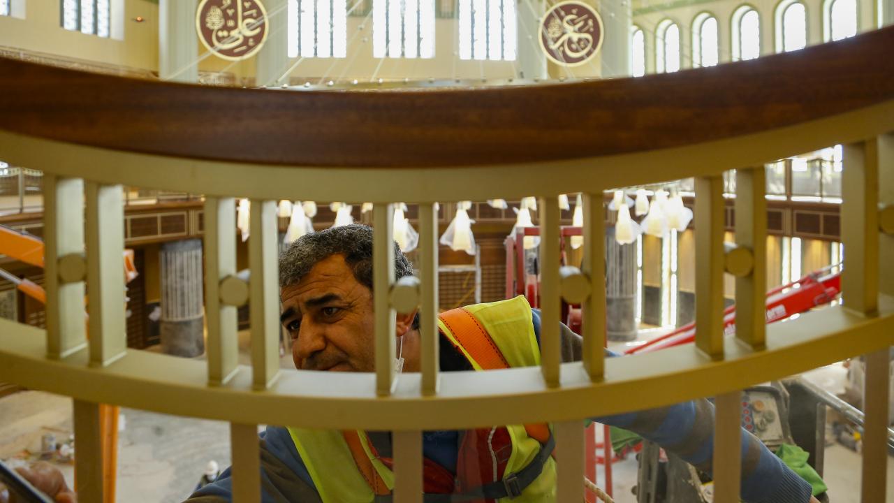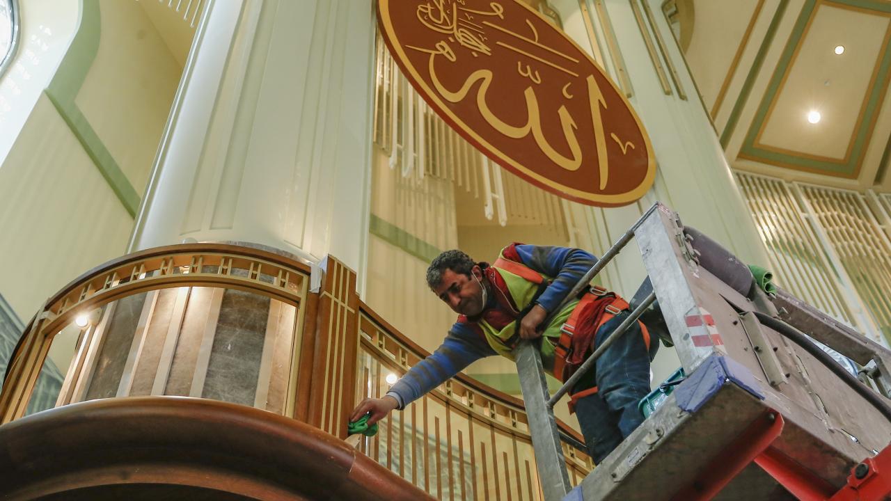 Öte yandan cami içine inşaat için kurulan iskeleler sökülüp, boyama işlemlerindeki ince işçiliğe geçildi. Namaz alanının ahşap duvar kaplamaları tamamlanırken, pencerelere ise korkuluklar takıldı.