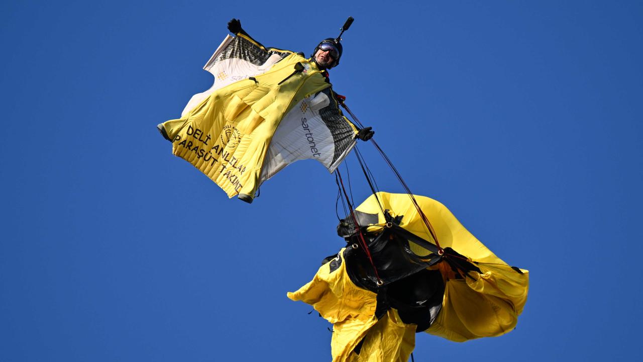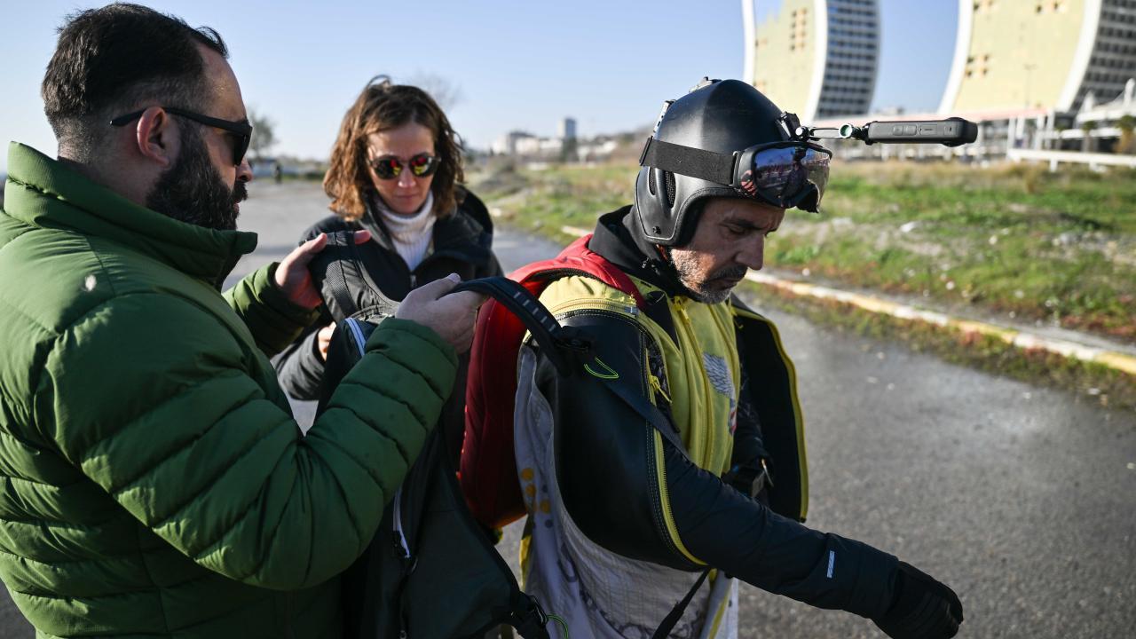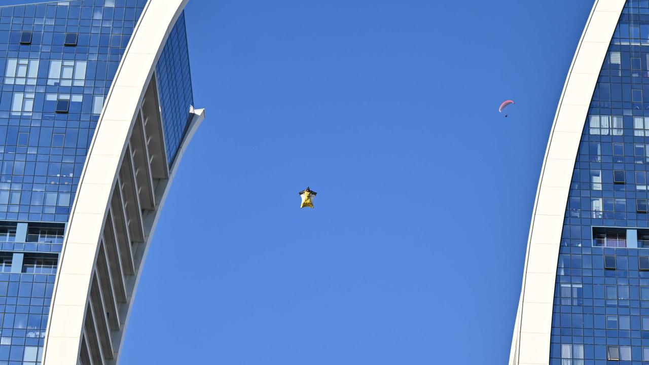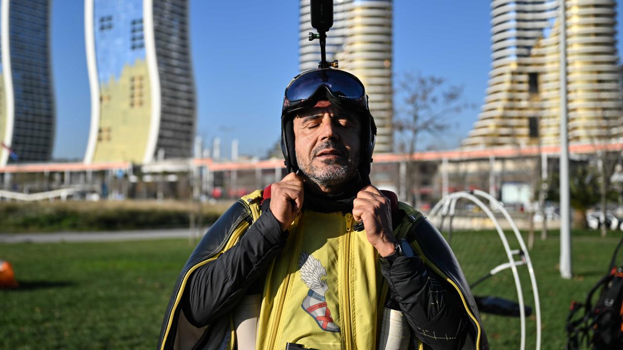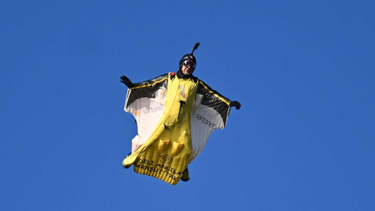 "Yarasa adam" olarak bilinen ekstrem sporcusu Cengiz Koçak, İstanbul'da 700 metre yükseklikte paramotordan atlayıp, iki binanın arasından geçerek Kartal Sahili'ne iniş yaptı.