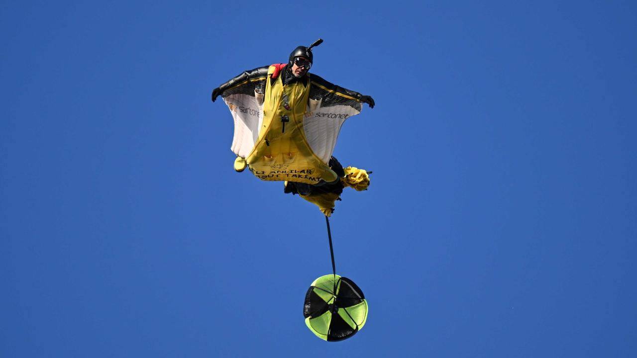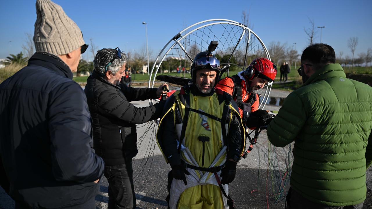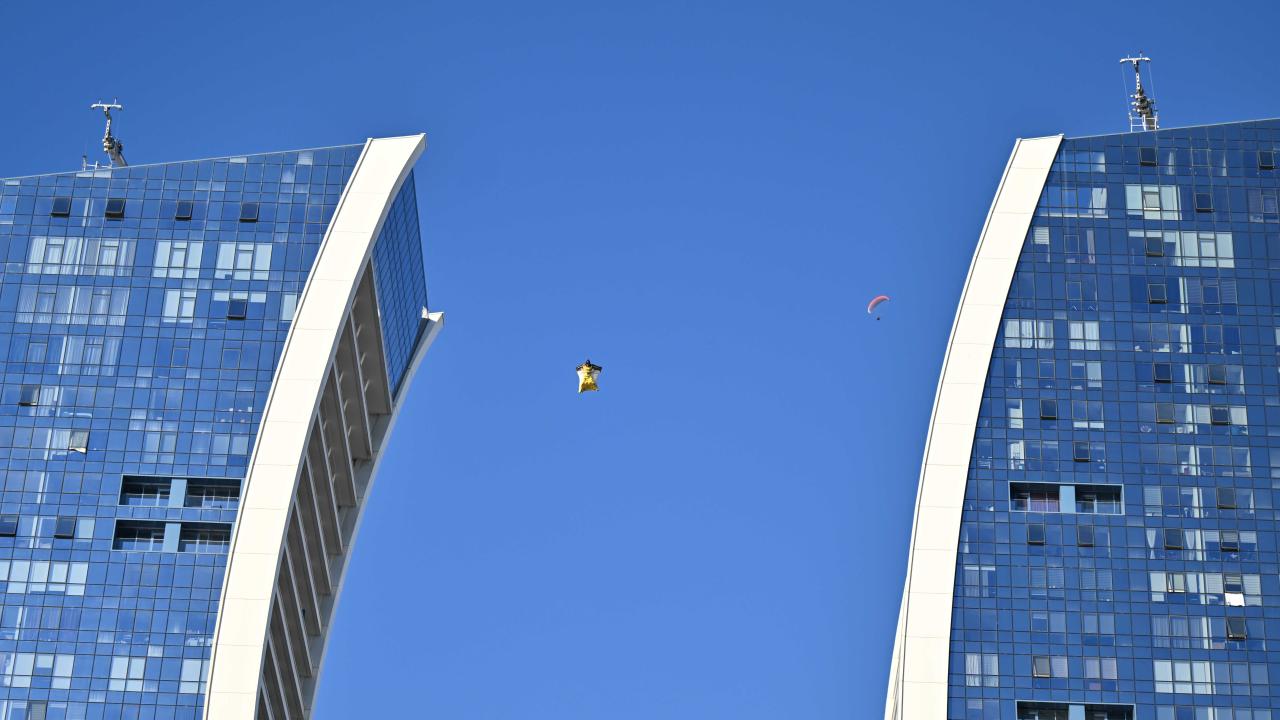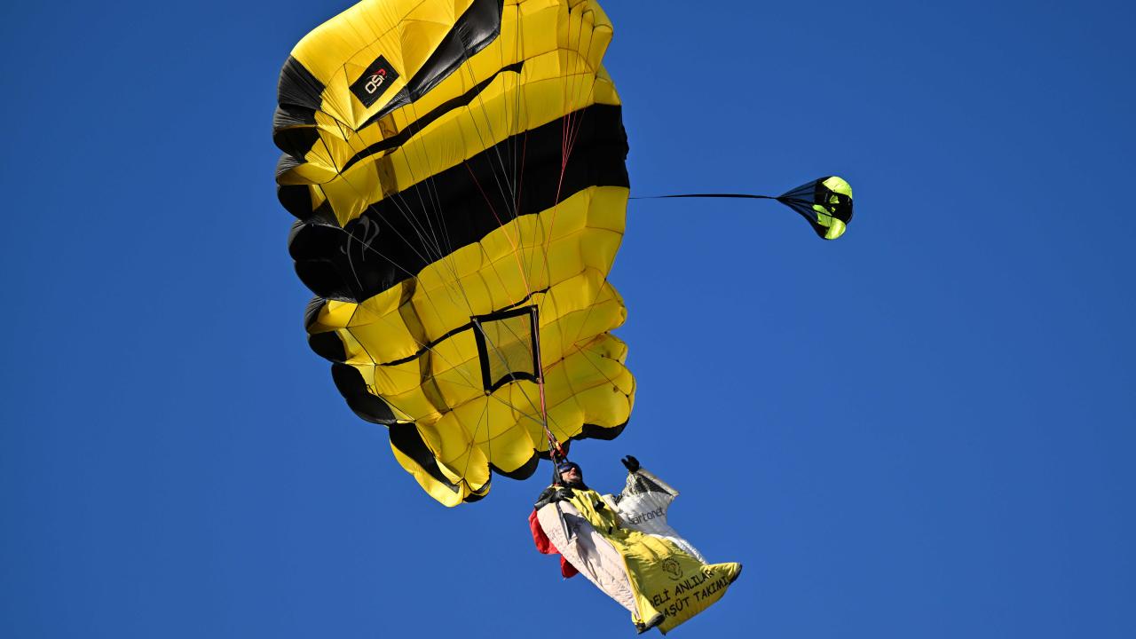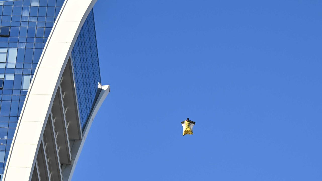 "Yarasa adam" olarak bilinen ekstrem sporcusu Cengiz Koçak, İstanbul'da 700 metre yükseklikte paramotordan atlayıp, iki binanın arasından geçerek Kartal Sahili'ne iniş yaptı.