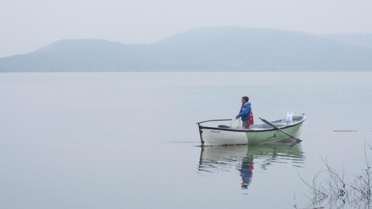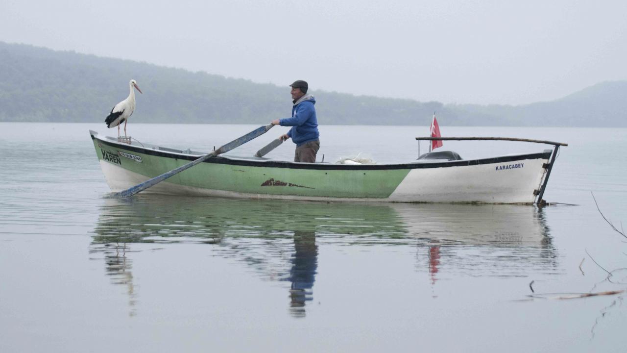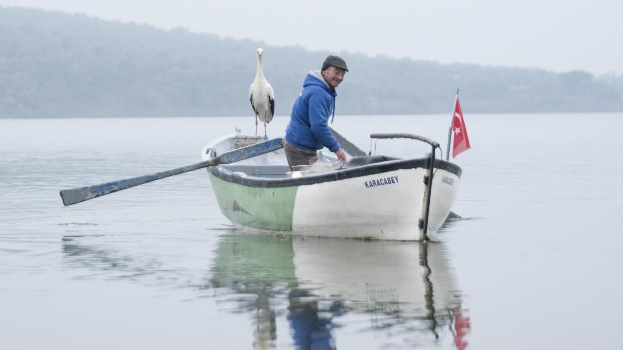 "Leylek köyü" olarak anılan mahallede göle ağ atan balıkçı Adem Yılmaz, Yaren leylekle kayığında yılın ilk buluşmasını gerçekleştirdi.