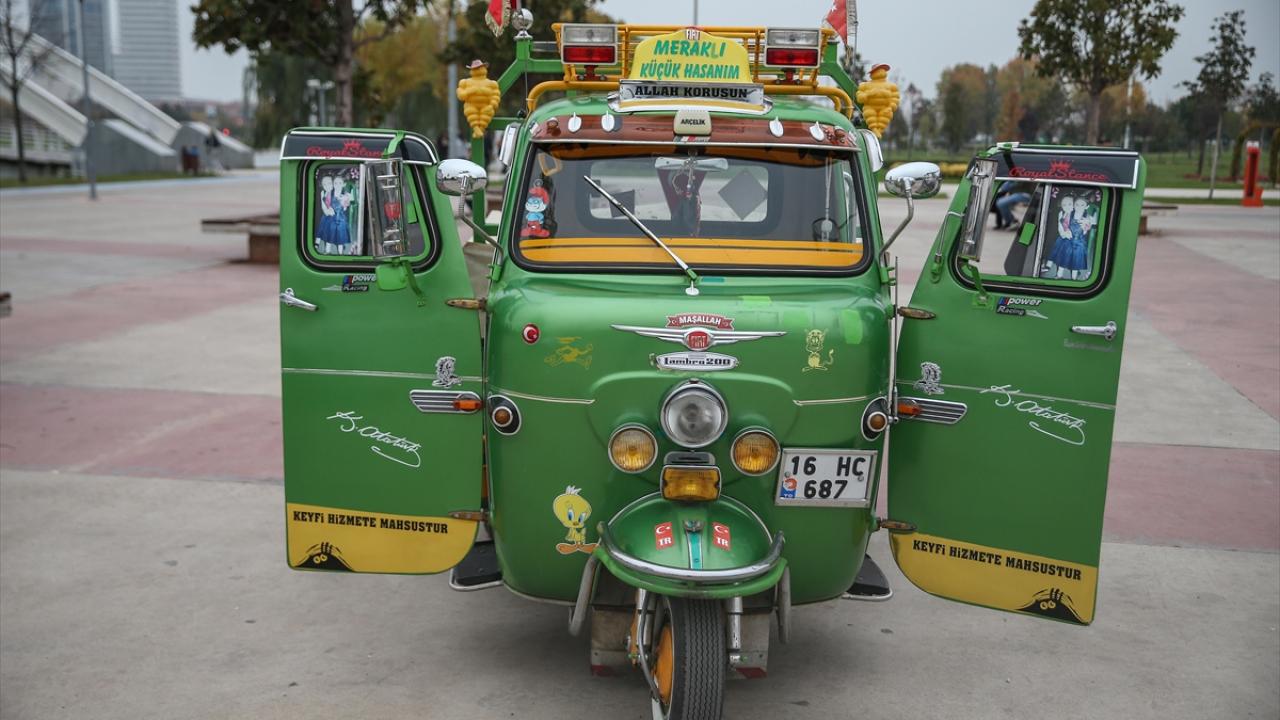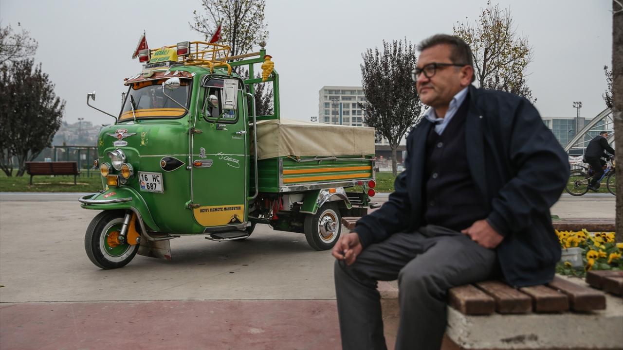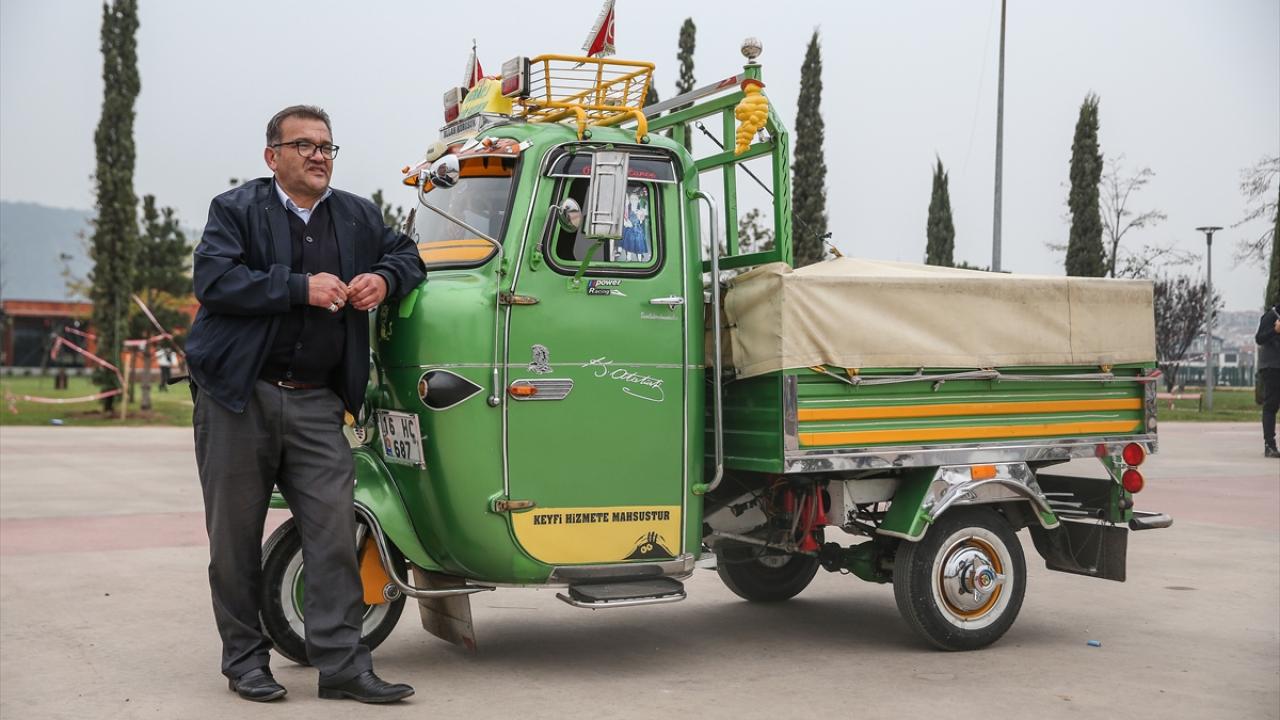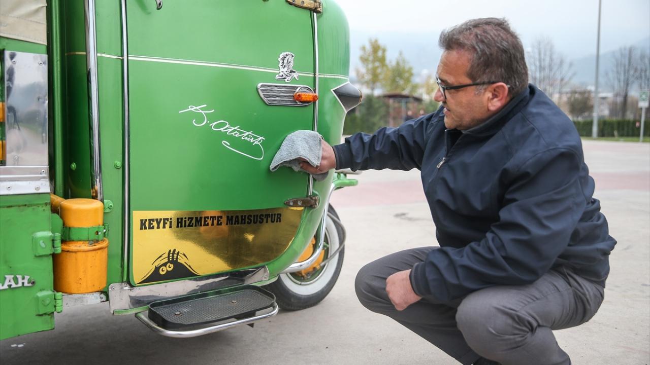 Bursa'da şehir içi otobüs şoförlüğü yapan Erol Çakmak, 6 yıl önce satın aldığı ve motorundan kaportasına birçok parçasını yenileyip süslediği 1970 model triportörüne özenle bakıyor.