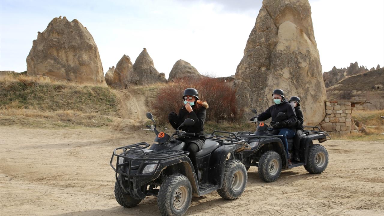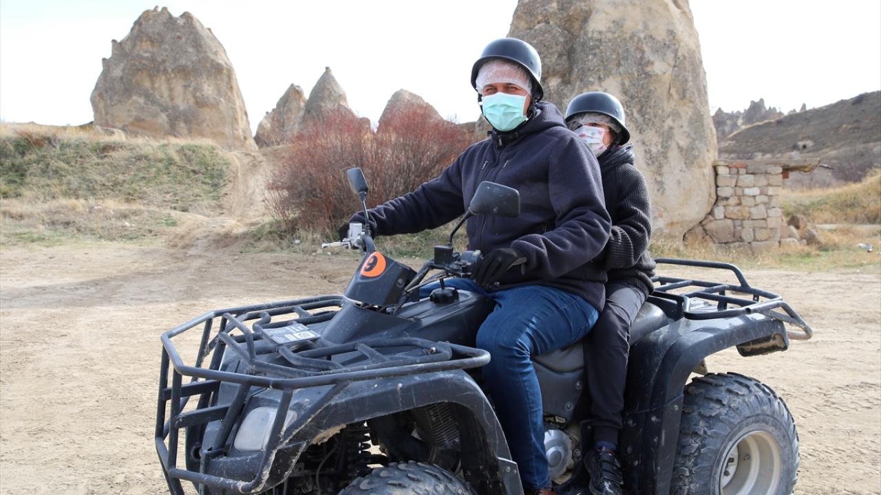 Yarıyıl tatilinde tercih ettikleri Kapadokya`da, peribacaları ve doğal kaya oluşumlarıyla kaplı vadilerde düzenlenen etkinliklere katılan konuklar, salgın kuralları çerçevesinde maske, mesafe ve hijyen koşullarına uygun gerçekleştirilen turlarda keyifli vakit geçiriyor.