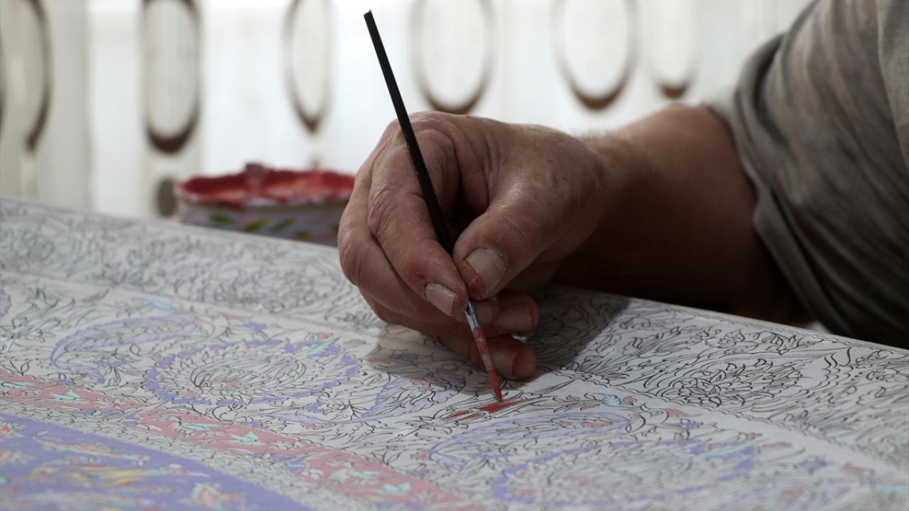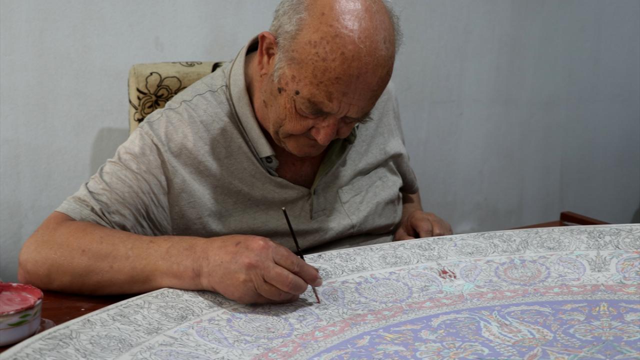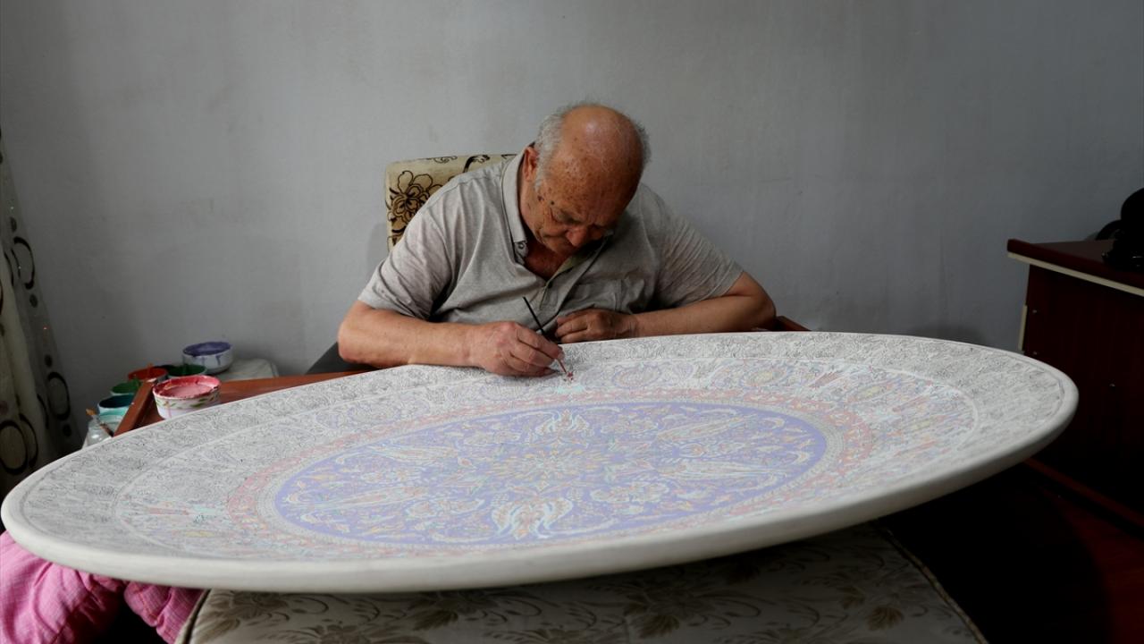 Birleşmiş Milletler Eğitim, Bilim ve Kültür Örgütünce (UNESCO) "Yaşayan İnsan Hazinesi" ödülü verilen Kütahyalı çini ustası Hamza Üstünkaya, Cumhurbaşkanı Recep Tayyip Erdoğan'a hediye etmek için 120 santimetre çapında hazırladığı çini tabağı kendine özgü desenlerle süslüyor.