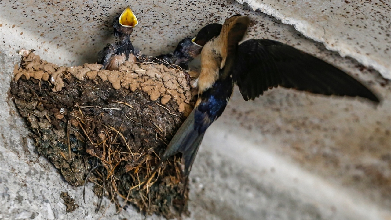 Anne kırlangıç geldiği anda sesli tepki vererek başını yuvadan dışarı çıkaran yavru kırlangıç, kendisine getirilen yemle besleniyor.