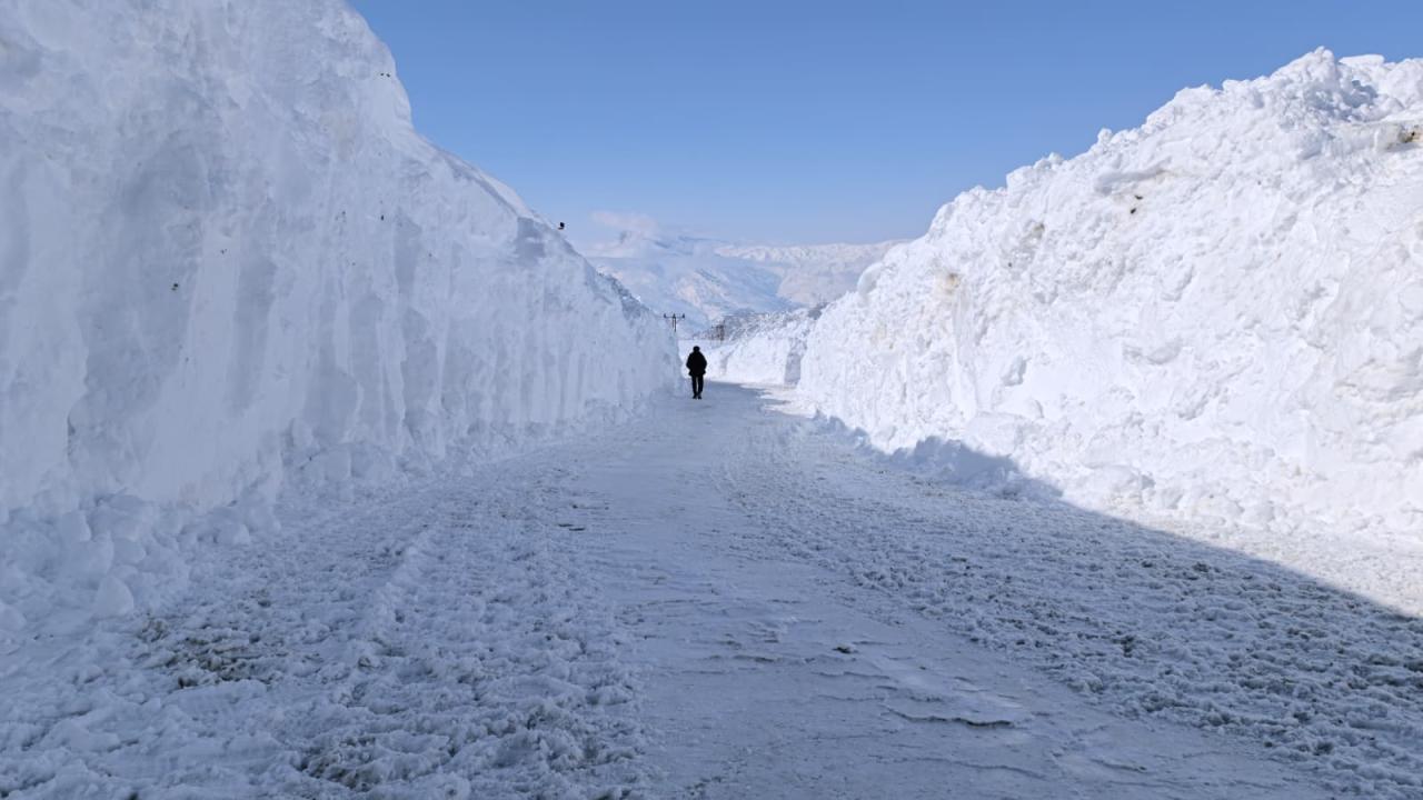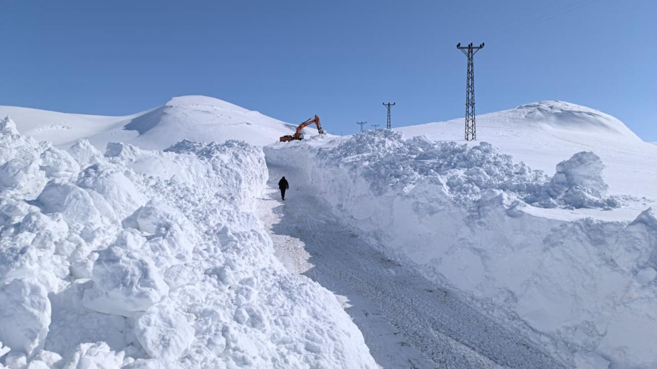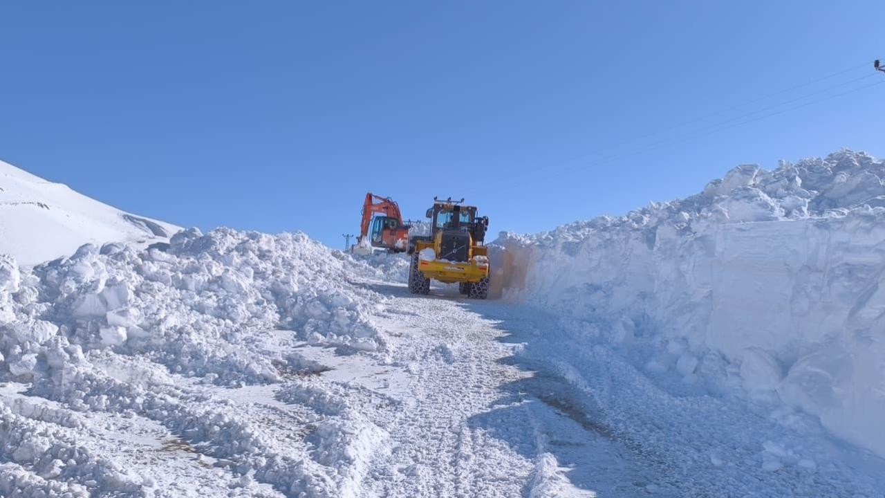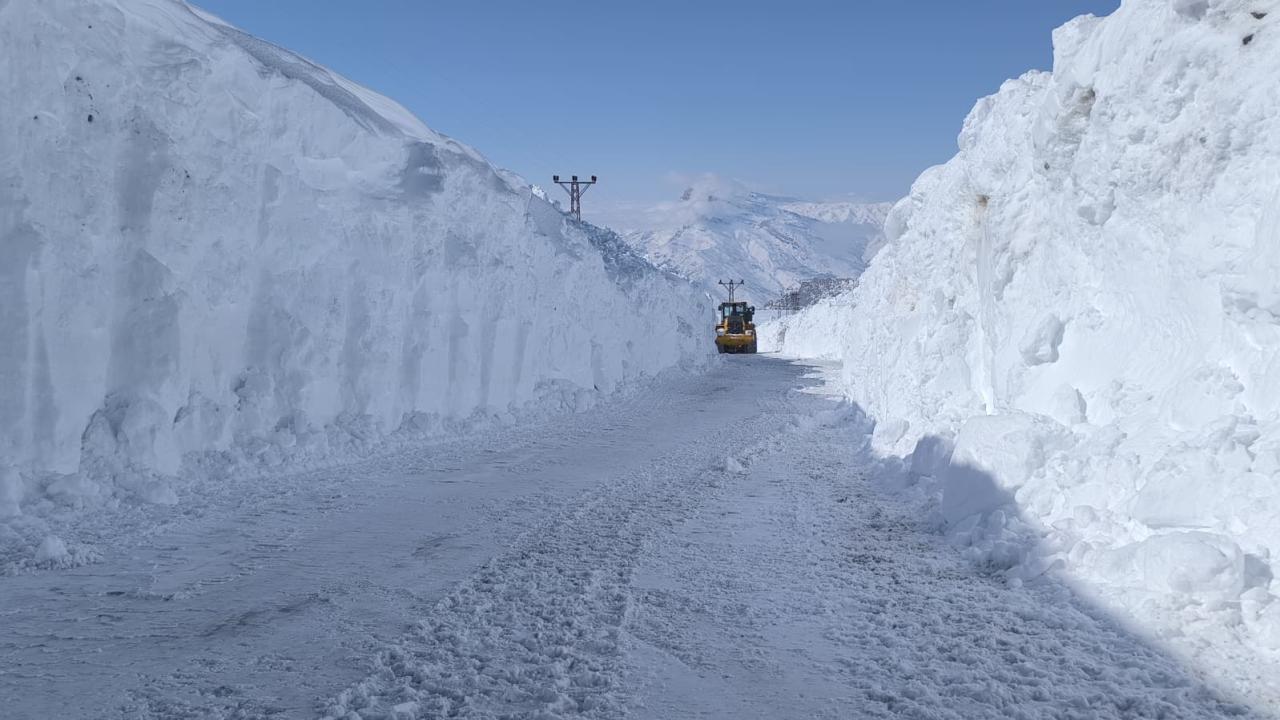 İlçeye yaklaşık 40 kilometre uzaklıktaki yayla yolunda, tipi nedeniyle yer yer 4 metreye kadar ulaşan kar kalınlığı ekiplerin çalışmalarını güçleştiriyor.