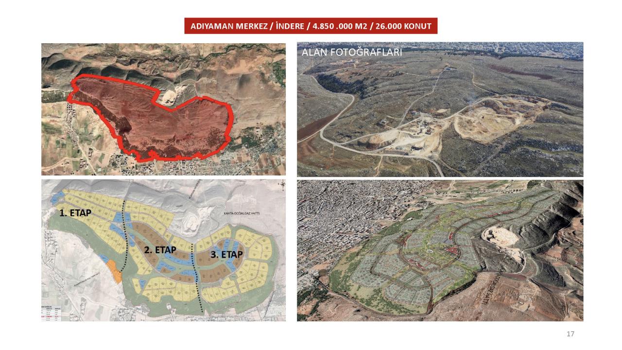 Adıyaman Merkez İndere Mahallesinde de 4 milyon 850 bin metrekare alan üzerine 3 etapta toplam 26 bin konut inşa edilecek.