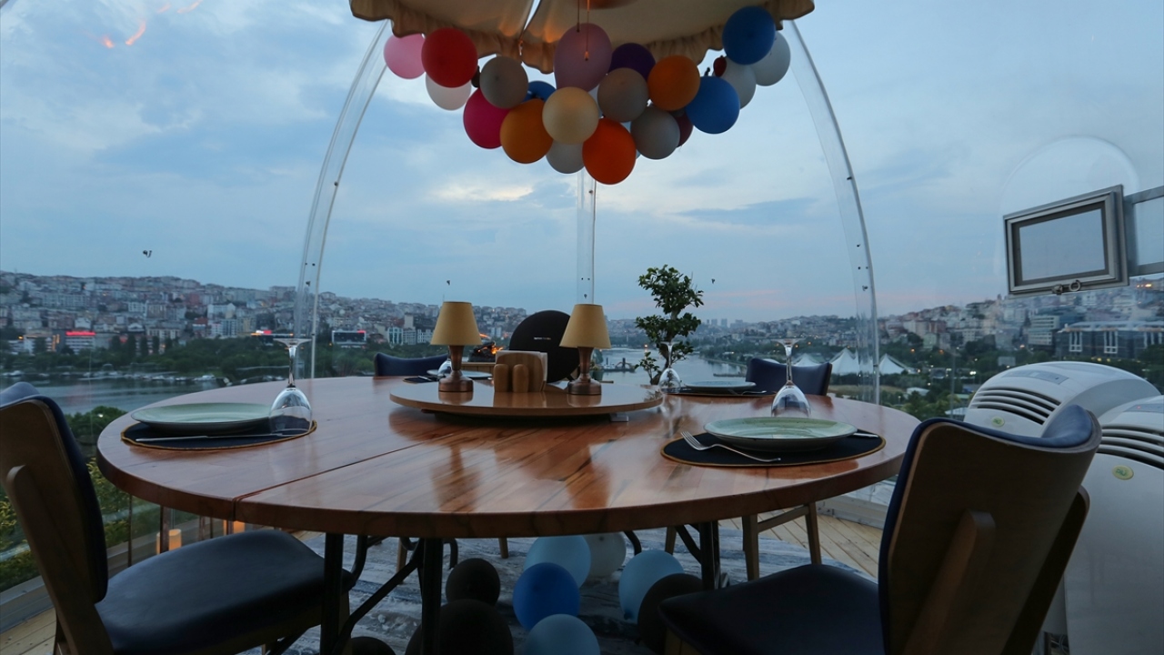 Yeni normalde Haliç manzaralı "fanus" içinde yemek modeli