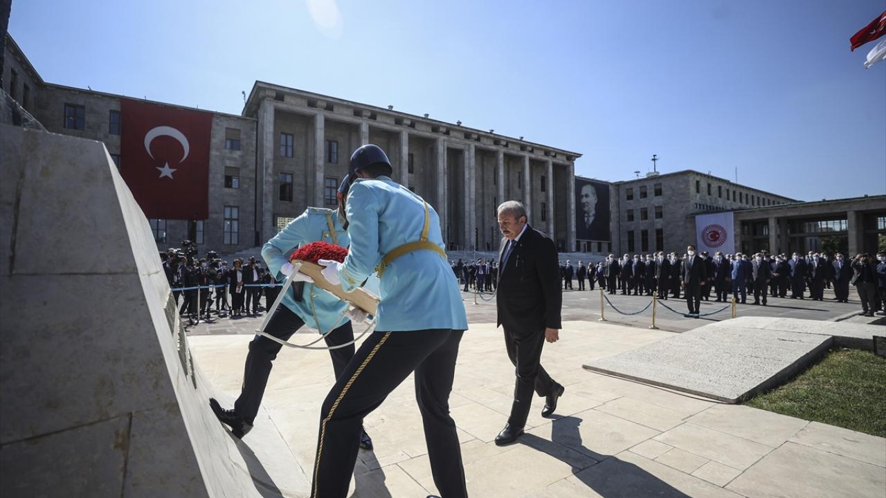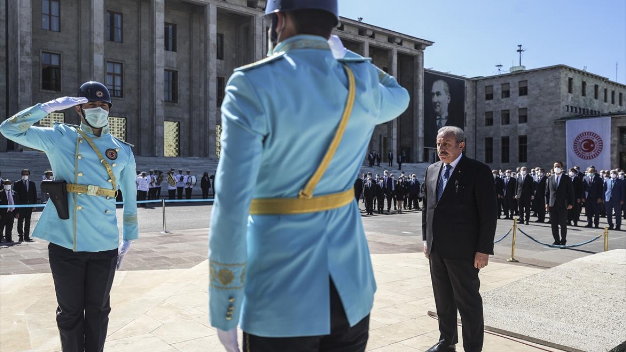 TBMM Başkanı Mustafa Şentop`un anıta çelenk koymasının ardından Polis Bandosu eşliğinde saygı duruşunda bulunularak İstiklal Marşı okundu.