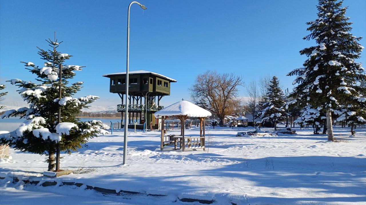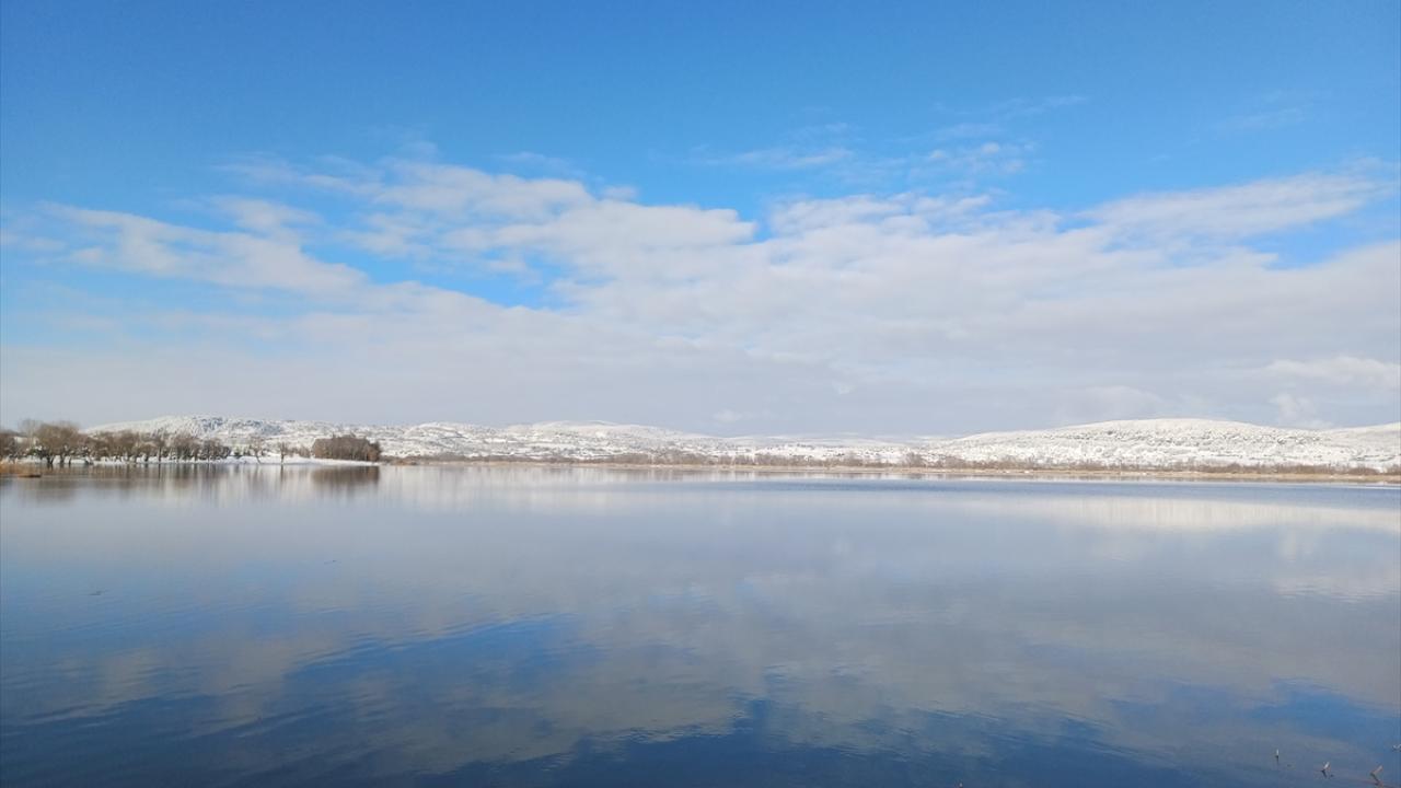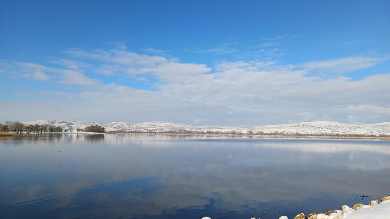Yeniçağa Gölü`nün çevresi yağan karla bir başka güzelliğe büründü.