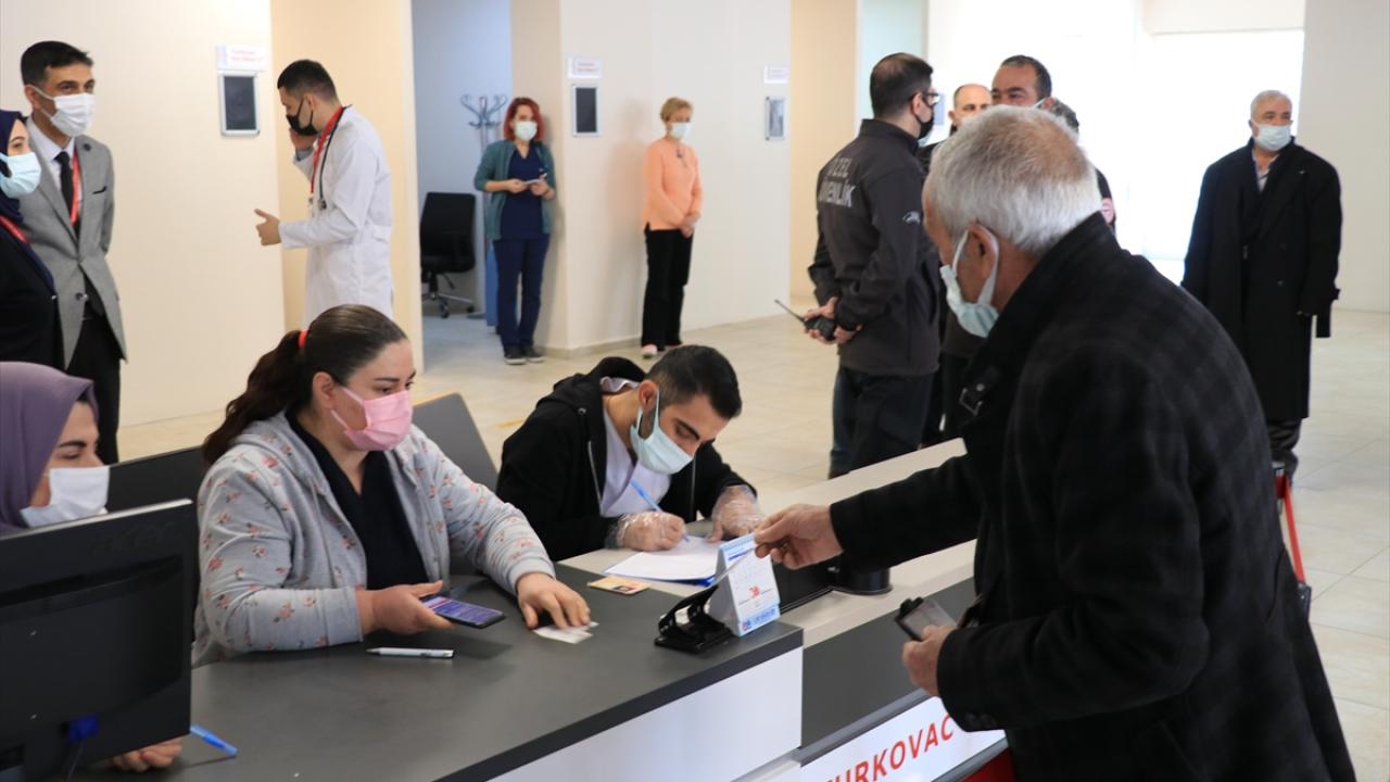 Hastanenin aşı odasındaki vatandaşlarla sohbet eden protokol üyeleri, kentte TURKOVAC`ın ilk uygulandığı vatandaşları tebrik etti, aşının hayırlı olması temennisinde bulundu.