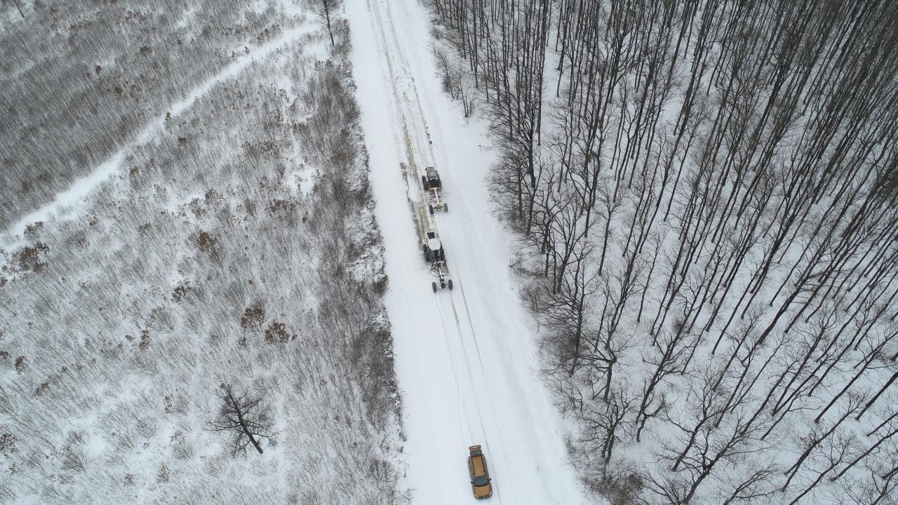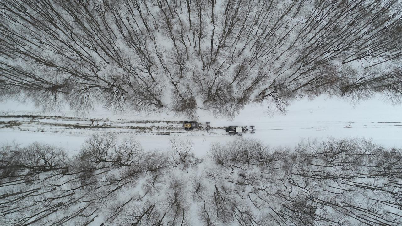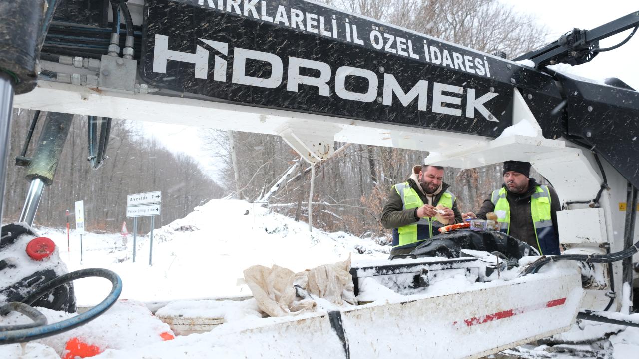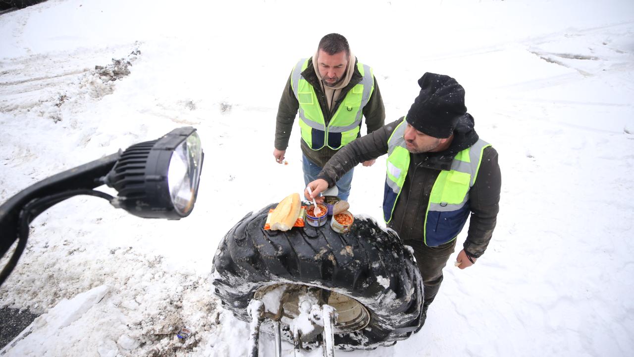 Zaman zaman sıcaklığın sıfırın altında 10 dereceye kadar düştüğü bölgede işçiler, öğle yemeklerini ormanlık alanda greyder tekerinin üzerinde kurdukları sofrada yiyor.