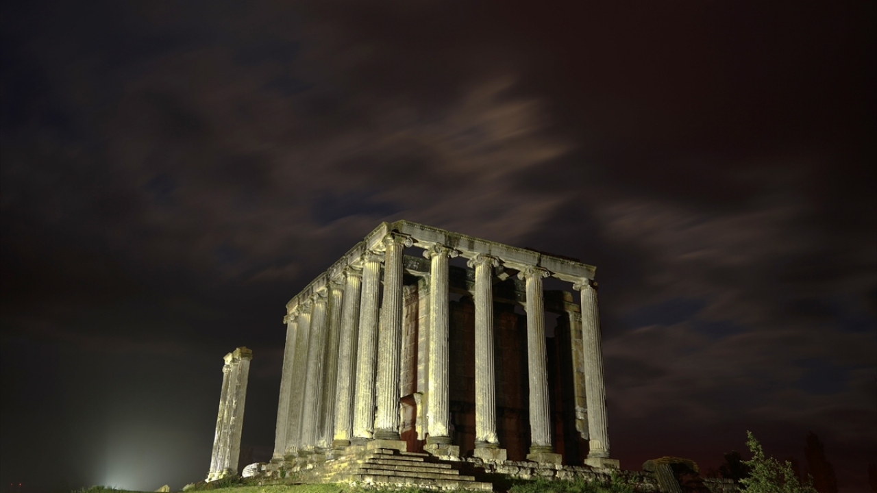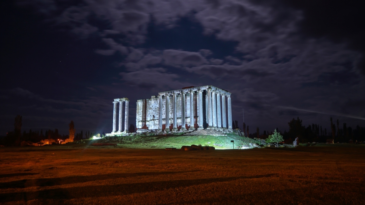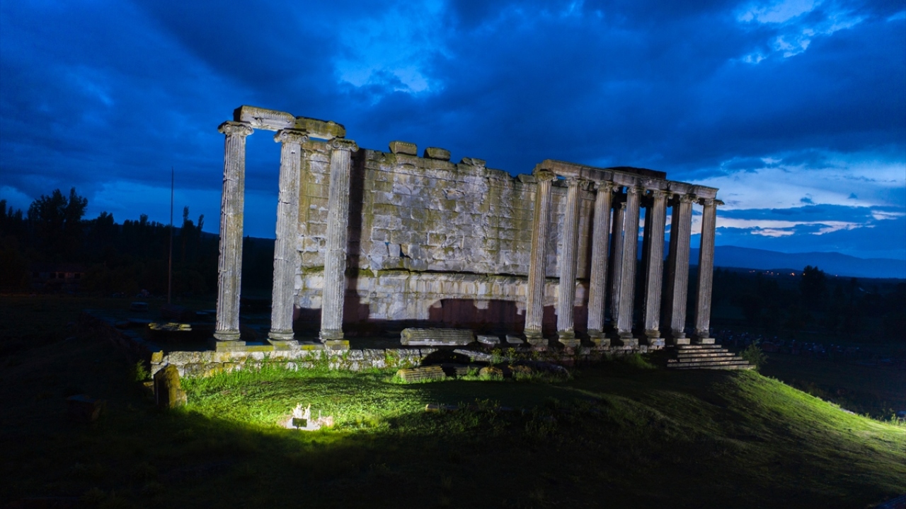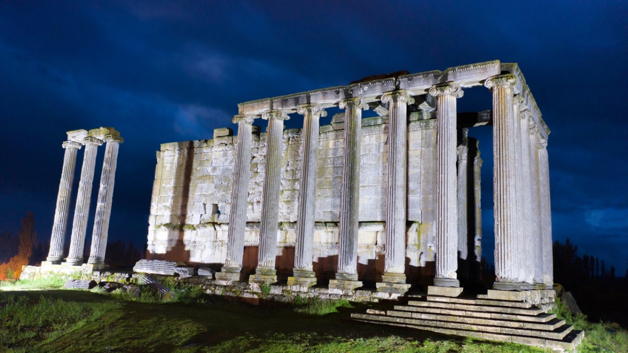 Kütahya'nın Çavdarhisar ilçesindeki Aizanoi Antik Kenti, yemyeşil düzlükte gece ve gündüz oluşan manzaralarıyla ayrı bir güzelliğe büründü.