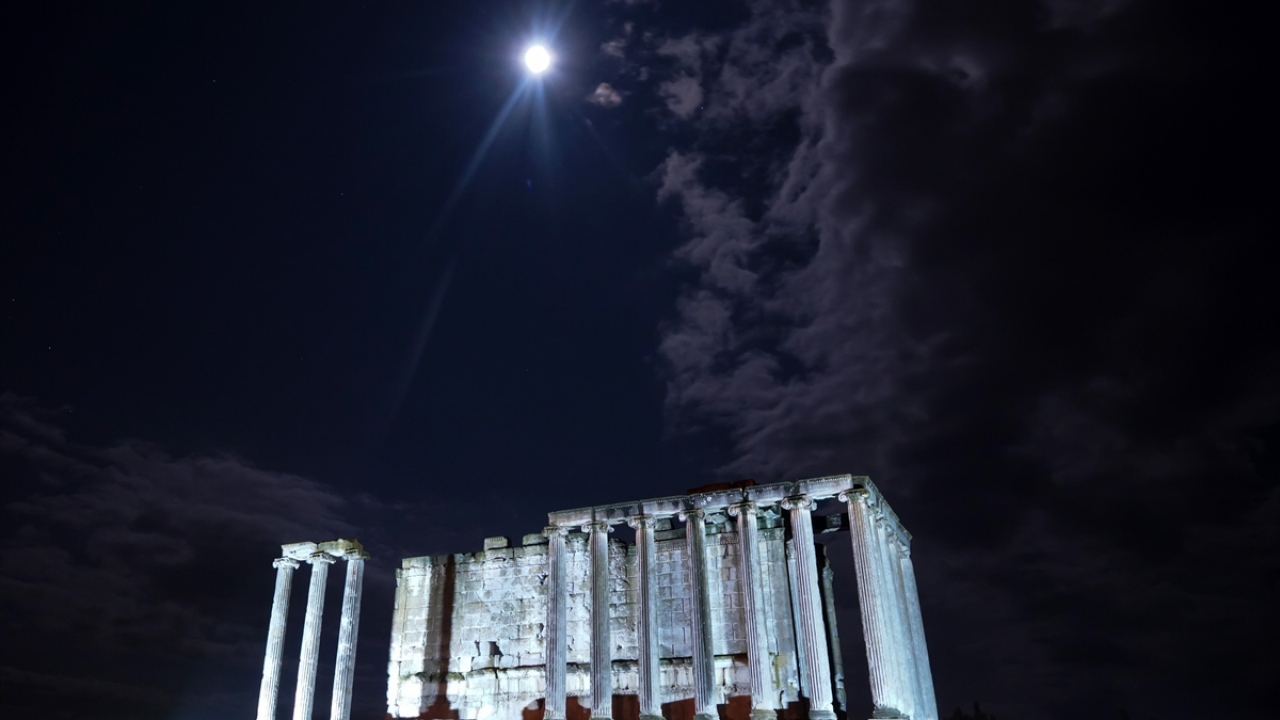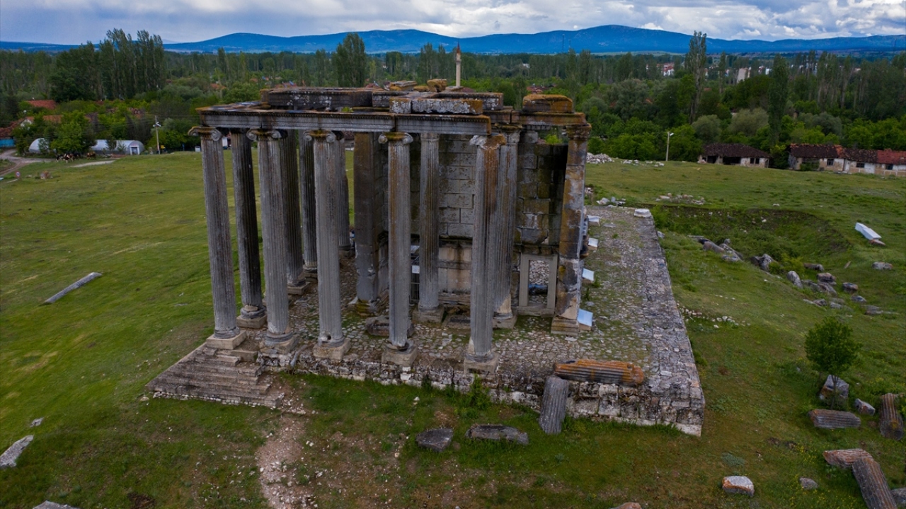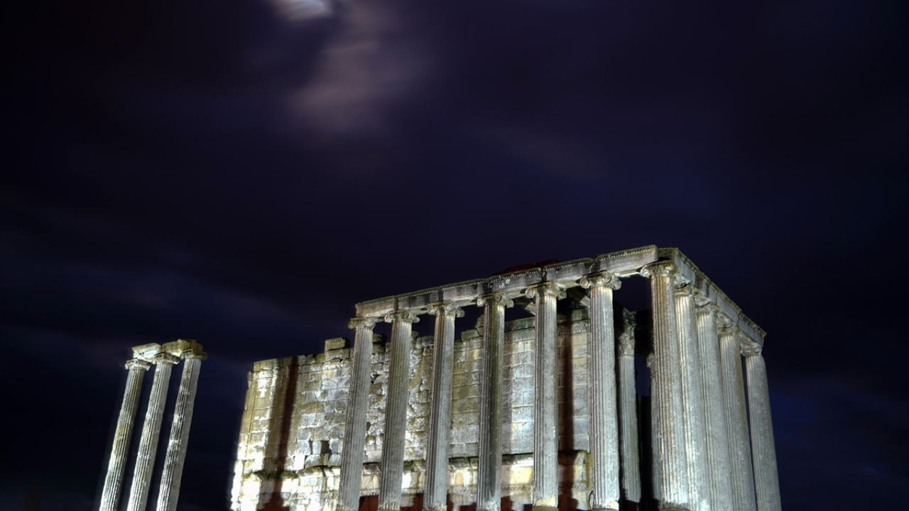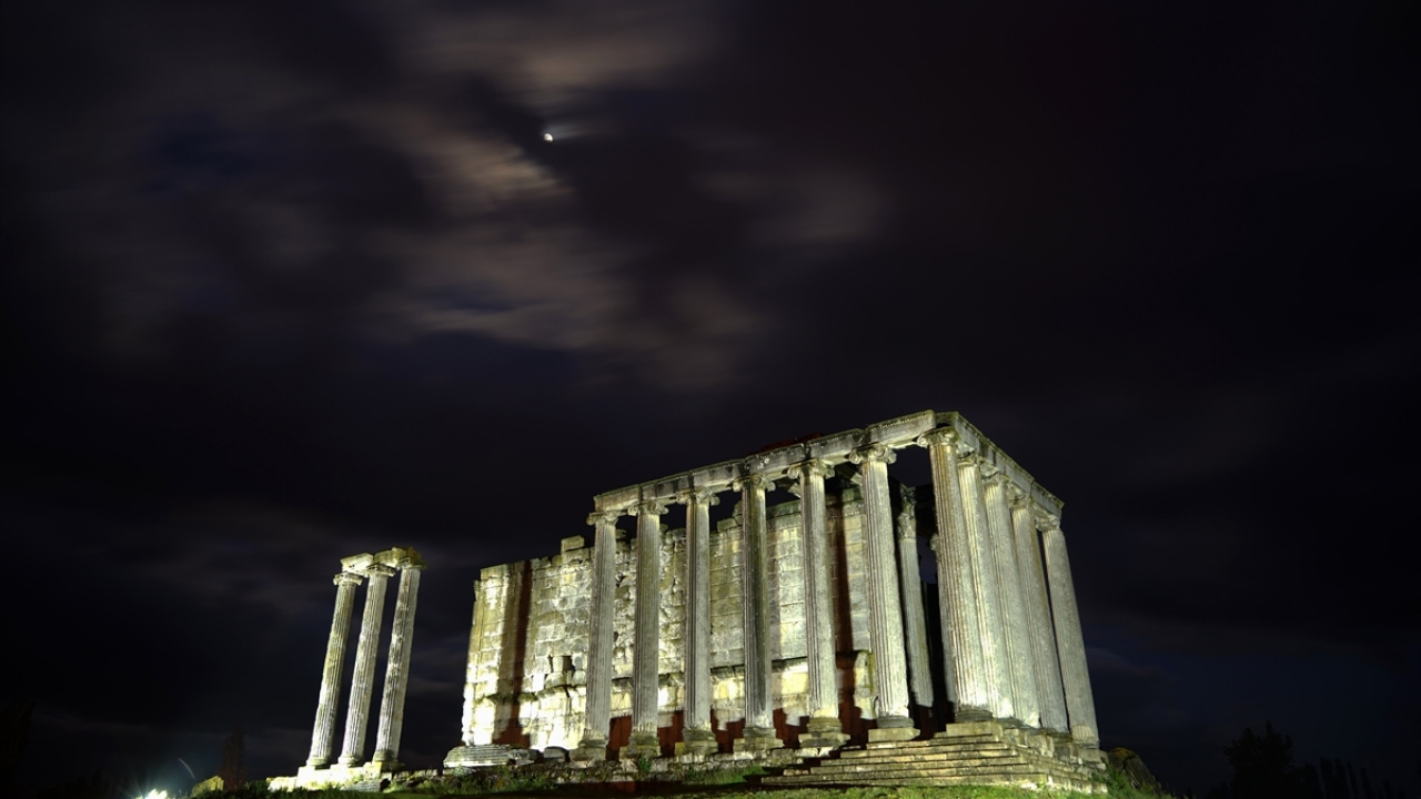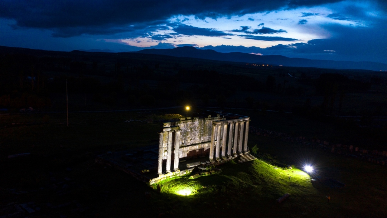 Kütahya'nın Çavdarhisar ilçesindeki Aizanoi Antik Kenti, yemyeşil düzlükte gece ve gündüz oluşan manzaralarıyla ayrı bir güzelliğe büründü.