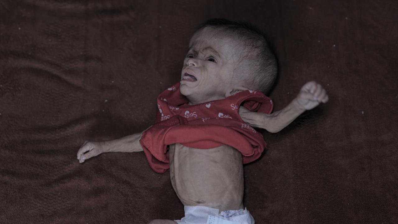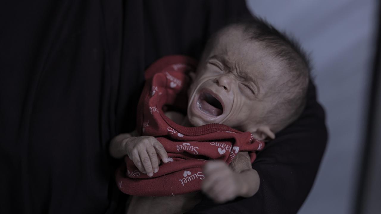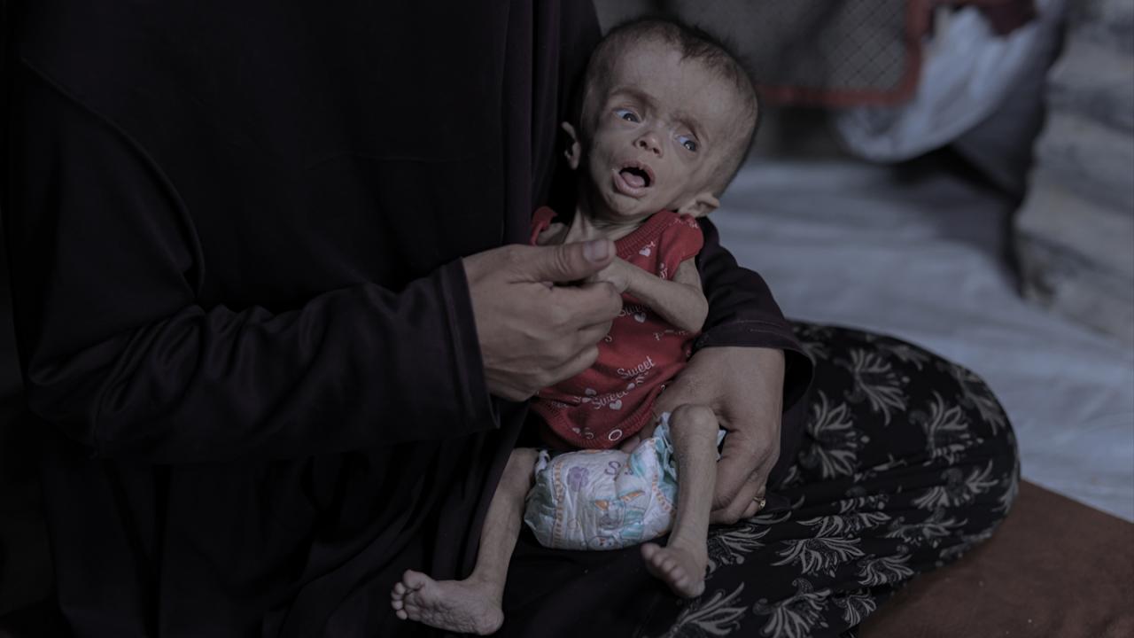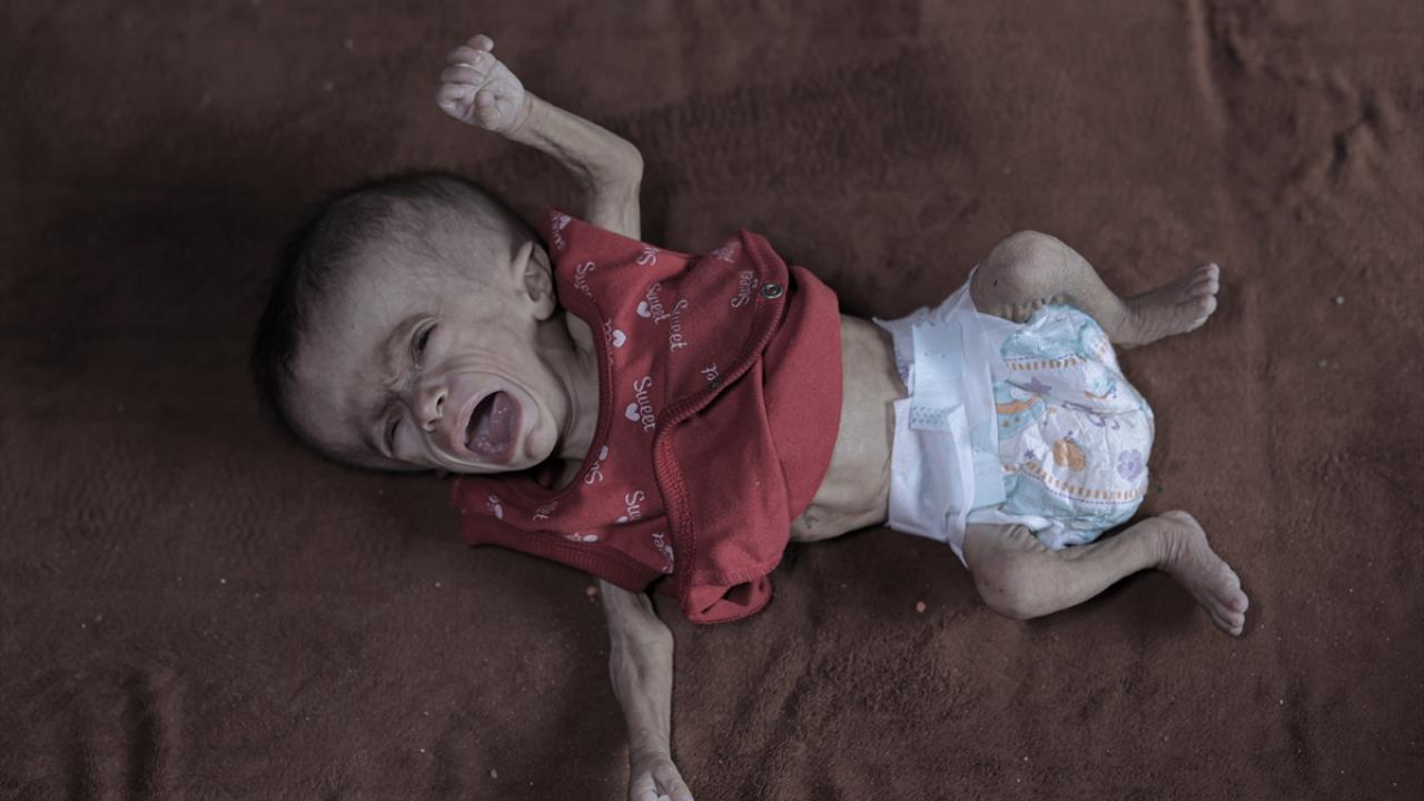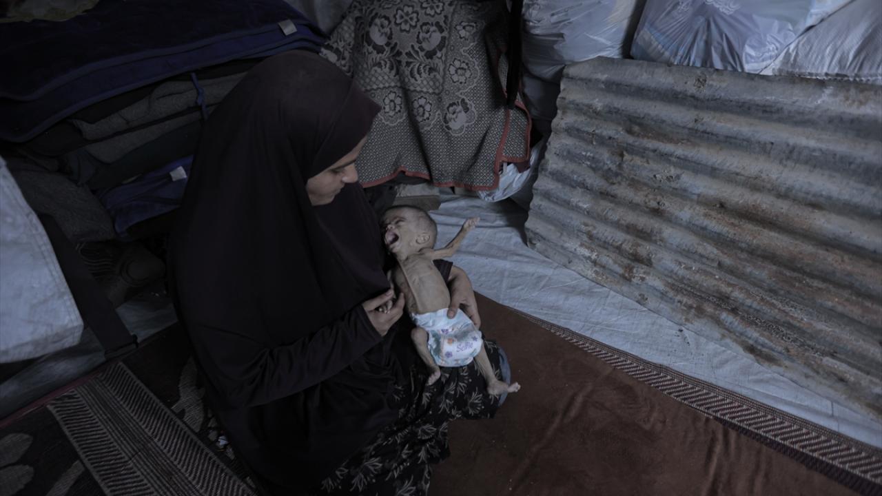 Gazze kentinin orta kesimindeki Yermuk bölgesinde yaşayan 5 aylık bebek Remzi Bahara, gıda ve tıbbi tedaviye erişimdeki yetersizlik nedeniyle şiddetli yetersiz beslenme sorunu yaşıyor.