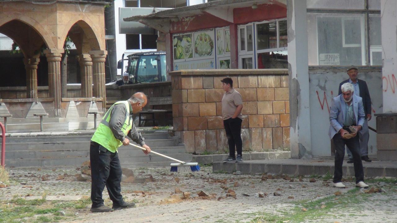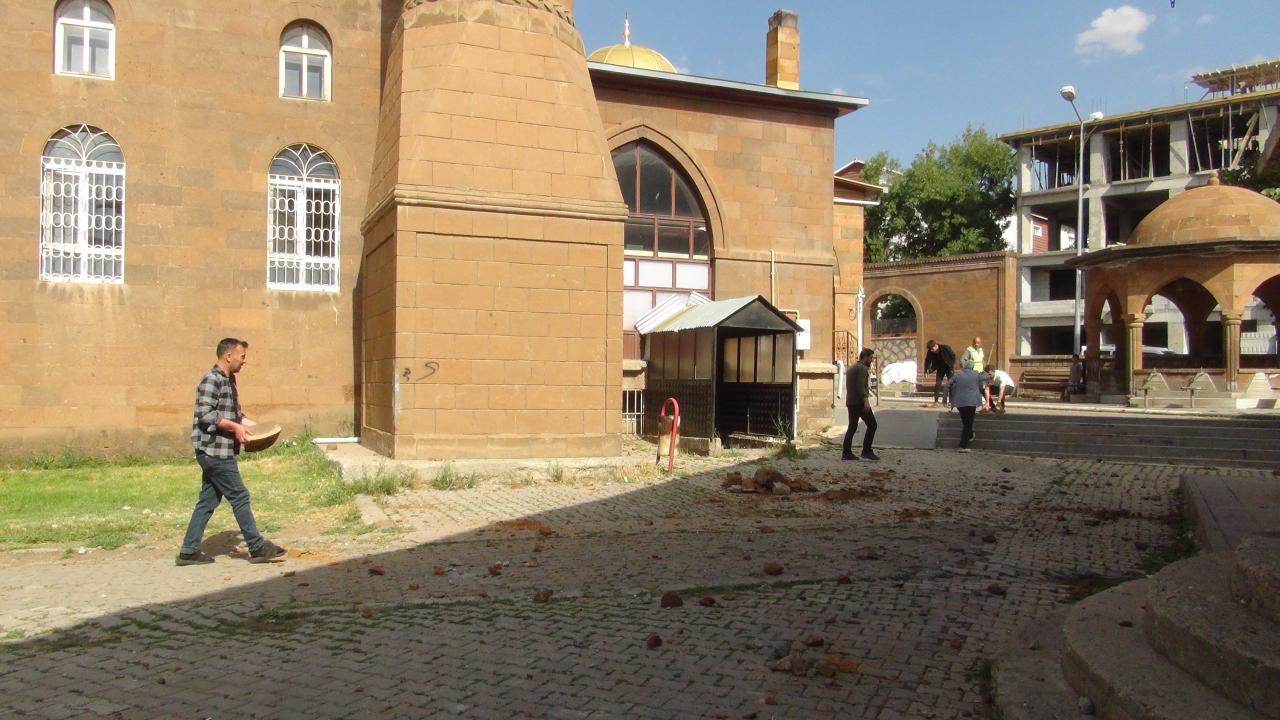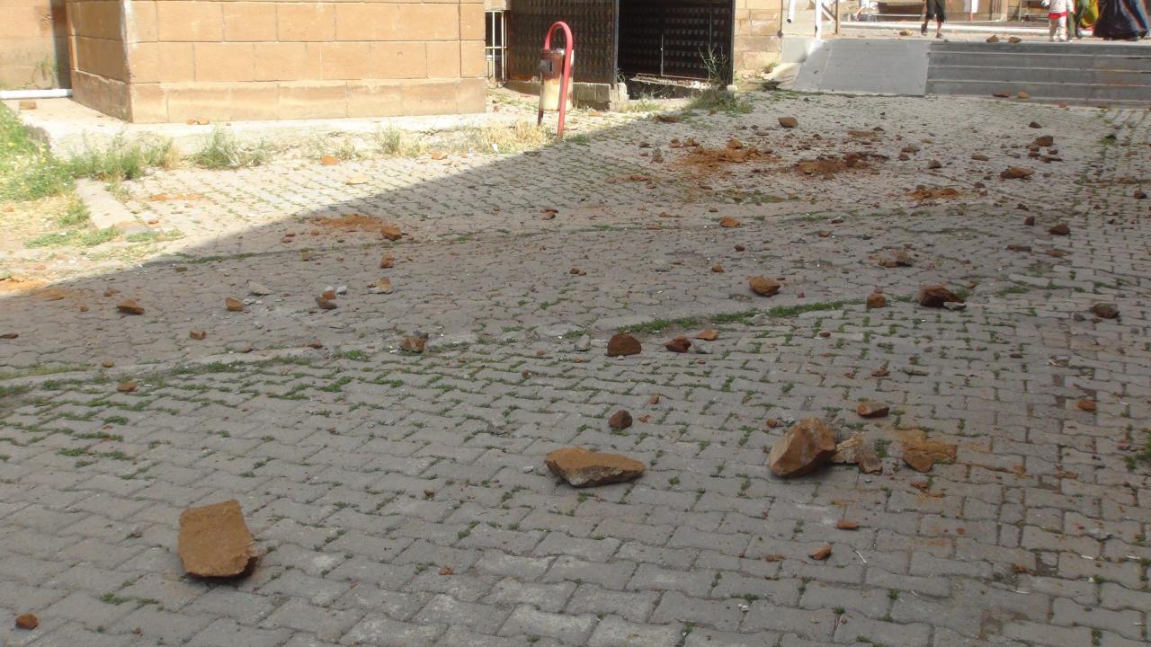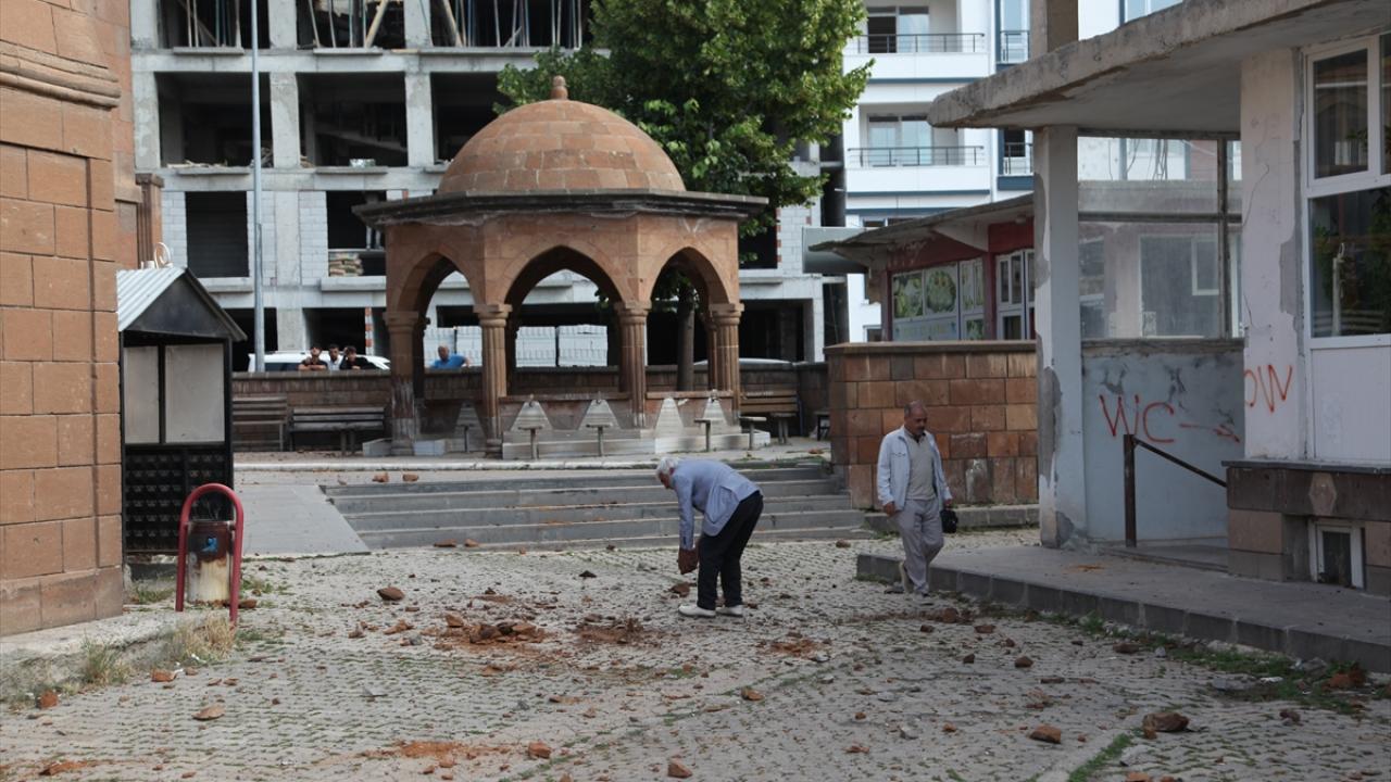 Minareden kopan taş ve molozların isabet ettiği müezzin Muhammet Akbaba, başından hafif yaralandı.