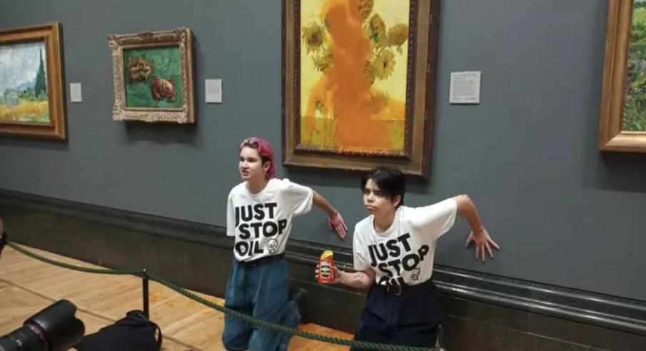 İngiltere`de sergilenen Vincent Van Gogh`a ait ünlü Ayçiçekleri tablosuna domates çorbası fırlattılar.
