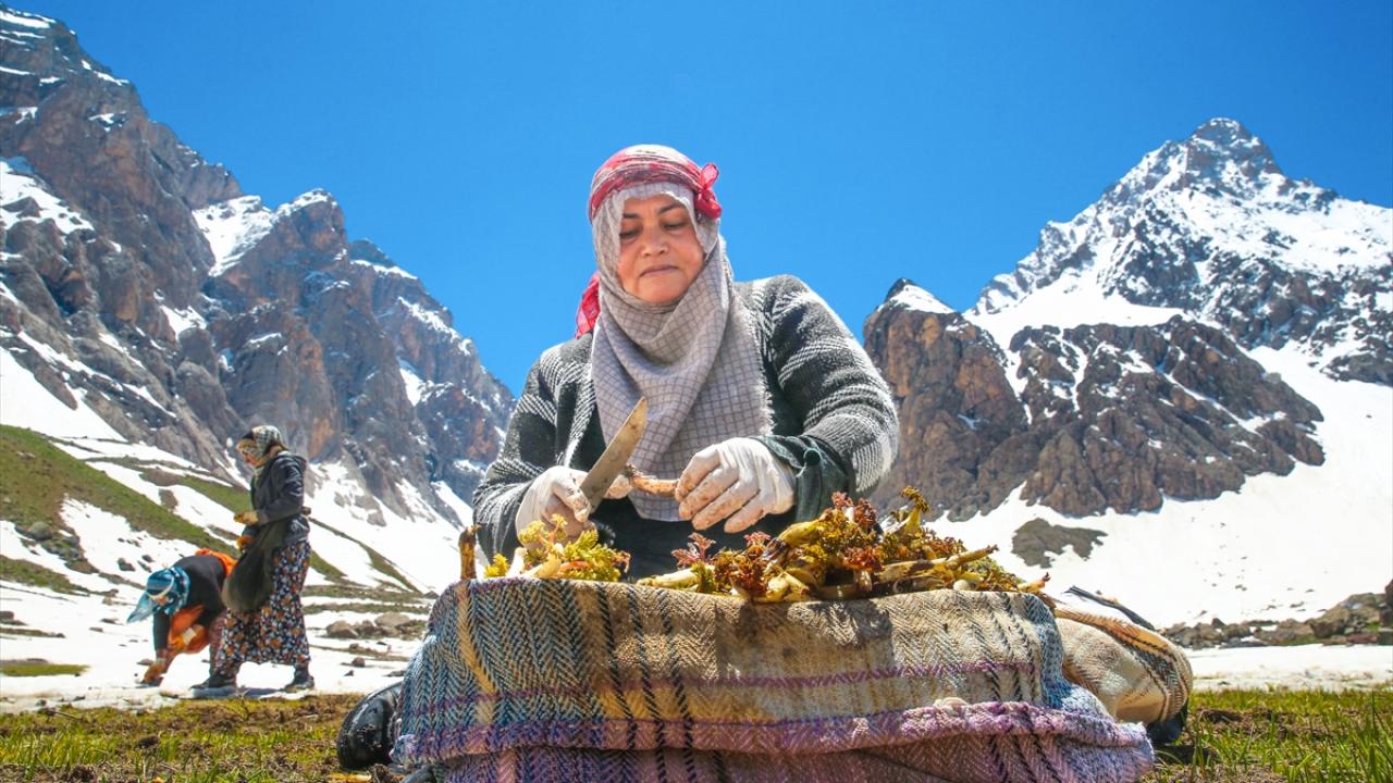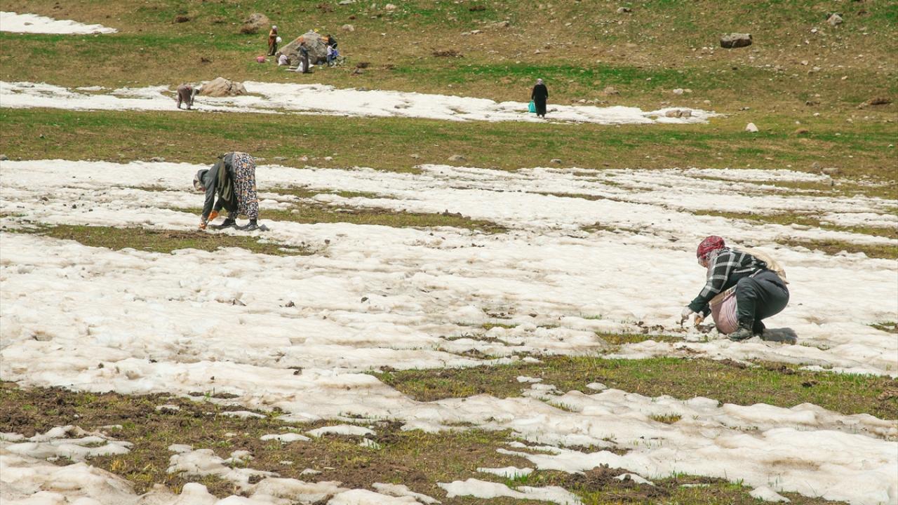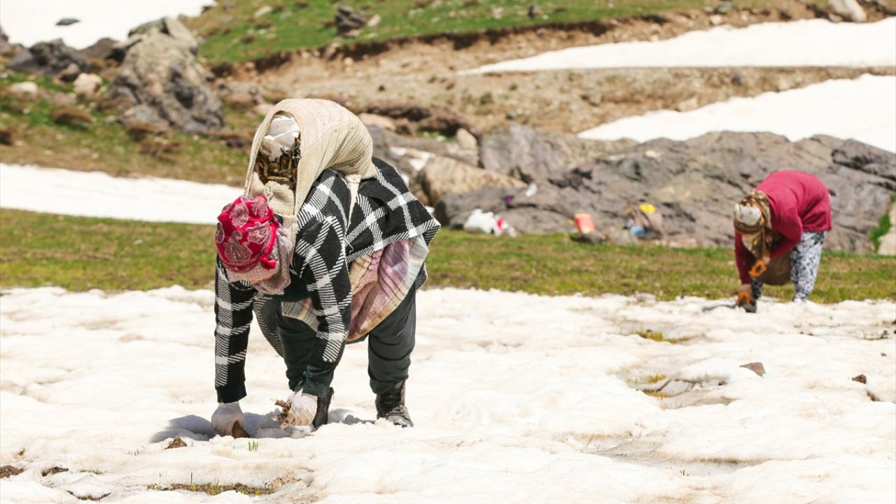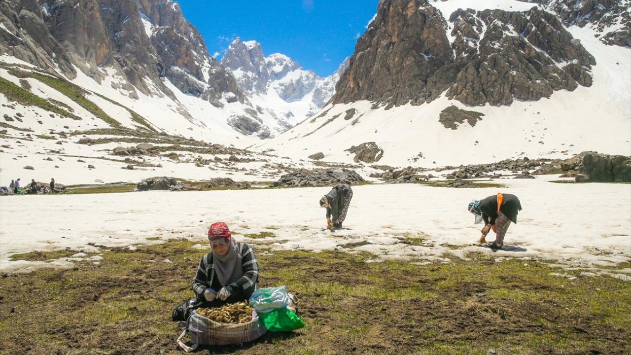 Hakkari'de Cennet Cehennem Vadisi'ndeki 3 bin 400 rakımlı yaylaya çıkan kadınlar, kar örtüsüyle kaplı bölgede, peynir yapımında ve yöresel yemeklerde kullanılan otların en tazesini toplamak için çaba gösteriyor.