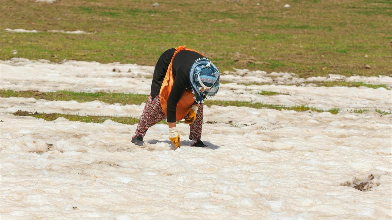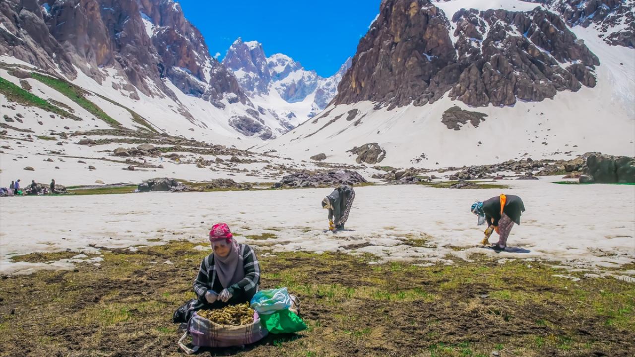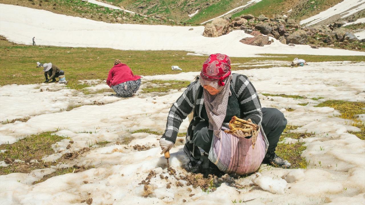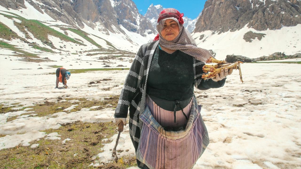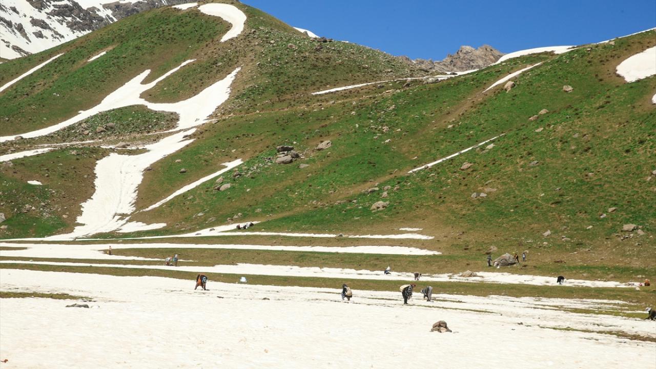 Hakkari'de Cennet Cehennem Vadisi'ndeki 3 bin 400 rakımlı yaylaya çıkan kadınlar, kar örtüsüyle kaplı bölgede, peynir yapımında ve yöresel yemeklerde kullanılan otların en tazesini toplamak için çaba gösteriyor.