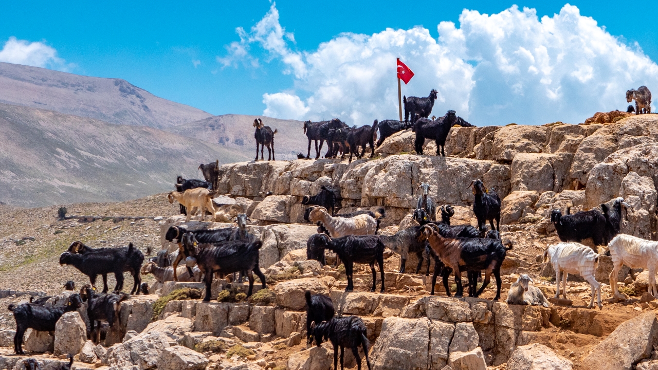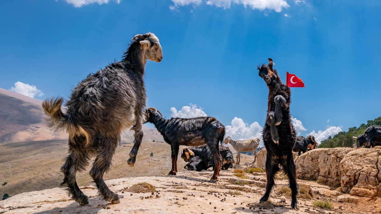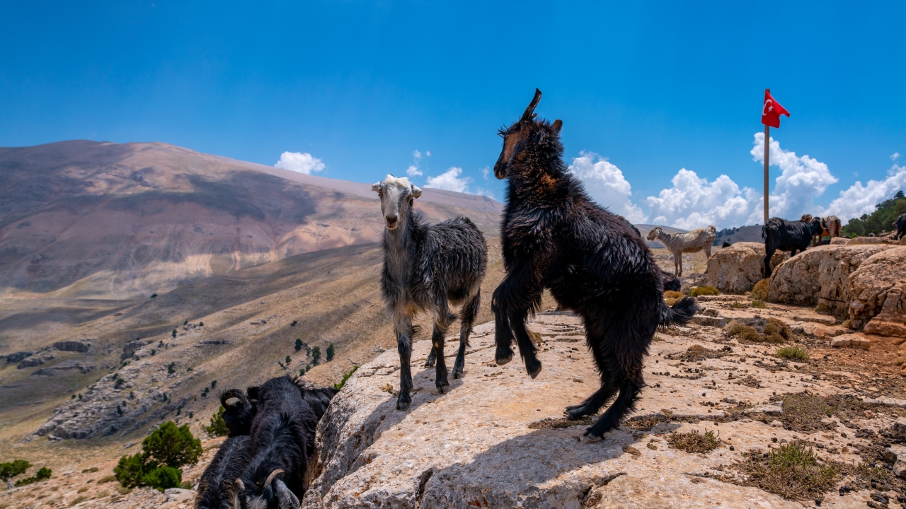 Kayalıklar üzerine kümelenmiş bir grup keçinin Kızlarsivrisi eşliğindeki görüntüleri objektiflere yansırken bir çift keçinin Türk Bayrağı önündeki mücadelesi ilgiyle izlendi.