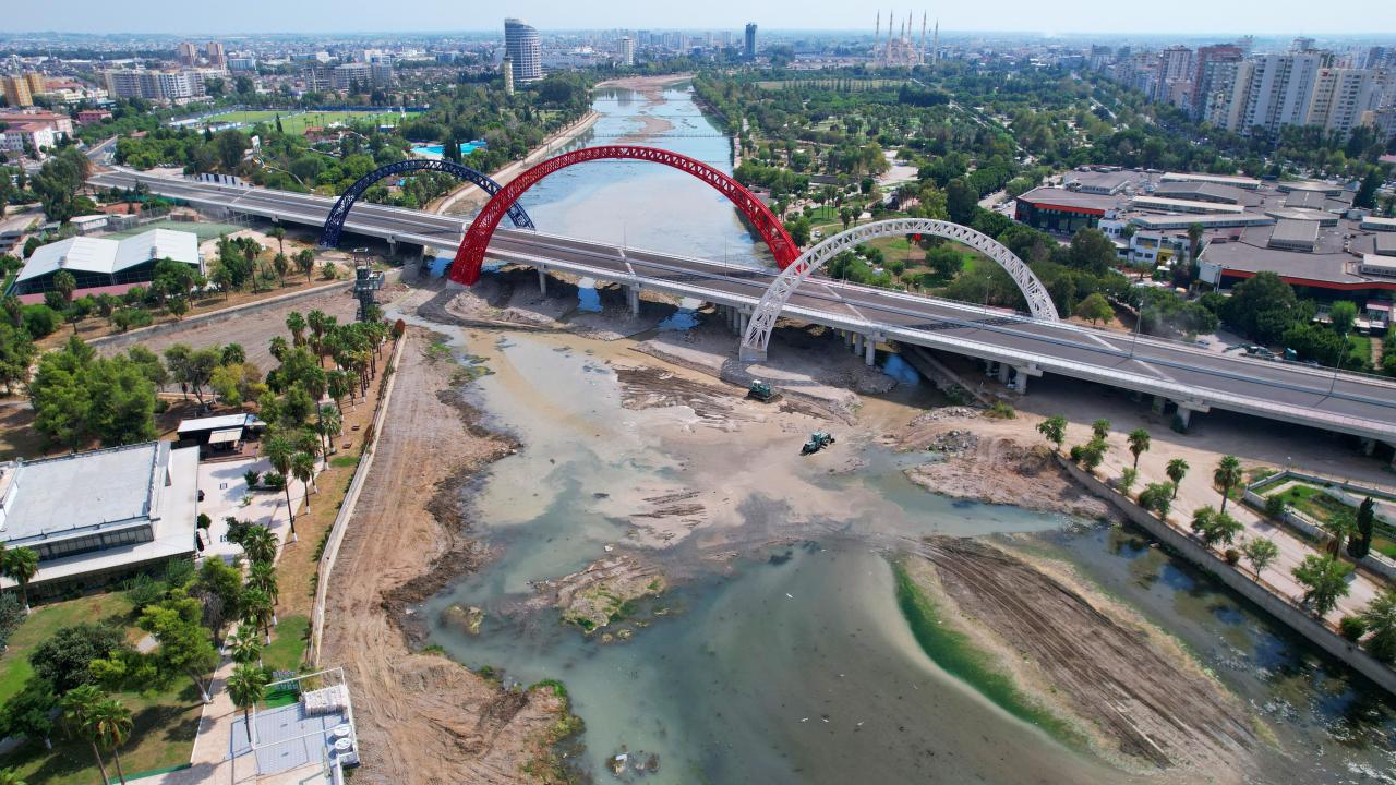 Adana`nın simgelerinden Seyhan Nehri`nde, Yavuzlar Köprüsü ve Yüksek Hızlı Tren hattı inşası nedeniyle bir süre önce su akışı durduruldu.