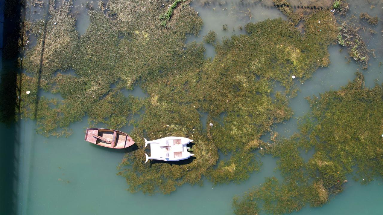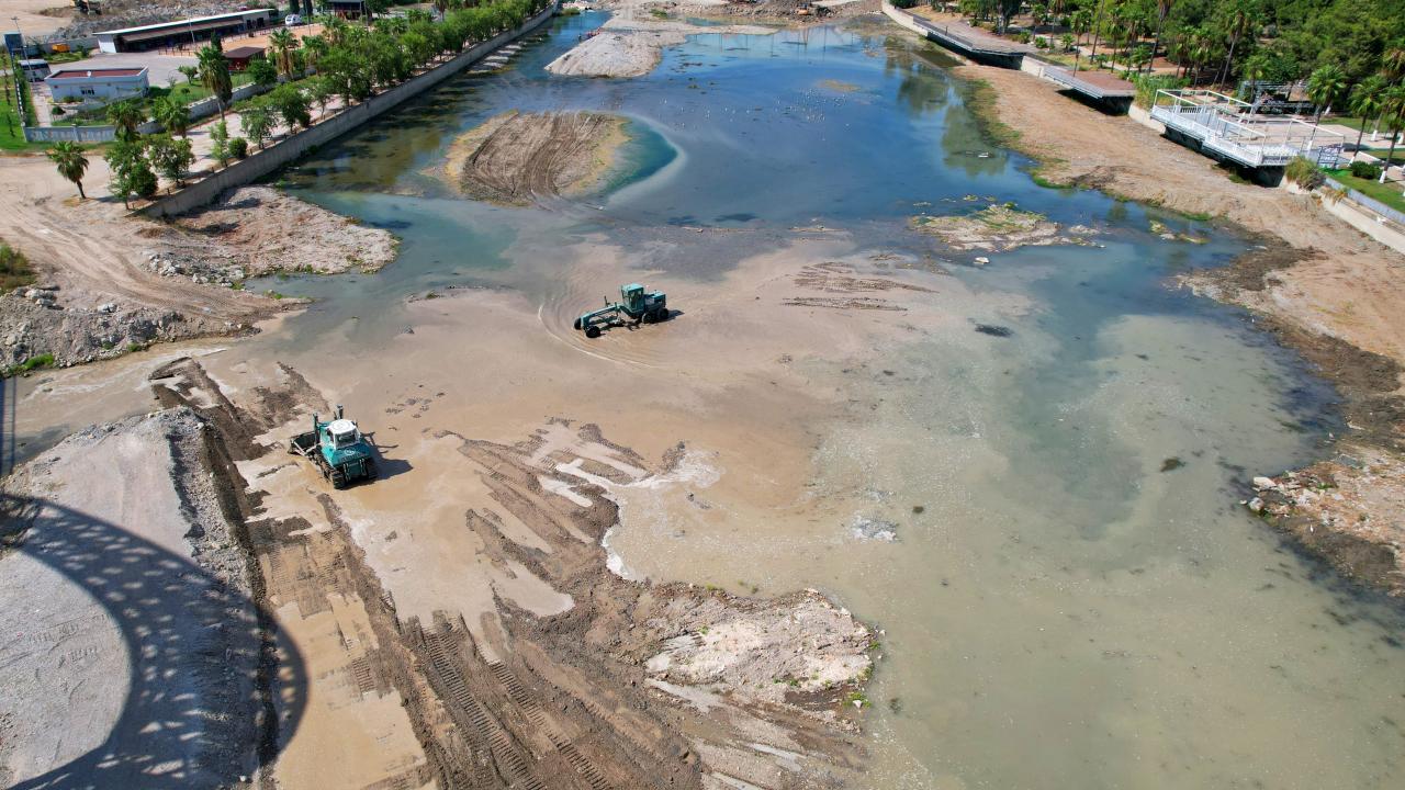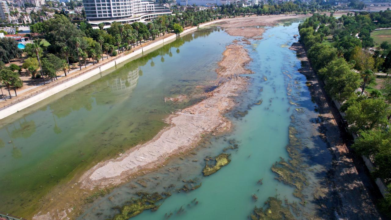 2 haftadır aralıksız çalışmalarını sürdüren ekipler, nehirdeki yosunları ve yüzeydeki atıkları temizlemek için yoğun mesai harcıyor. Çalışmalar dron ile de havadan görüntülendi.