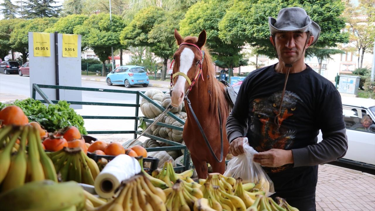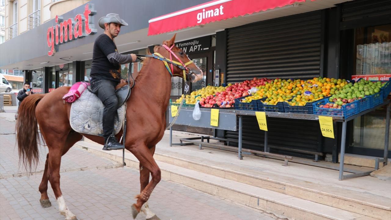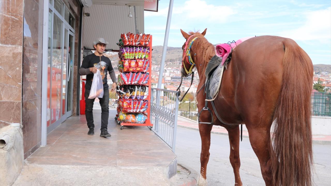 Fırından markete, sağlık ocağından pazara birçok yere at sırtında giden Çömez, şehir merkezinde vatandaşların dikkatini çekiyor.