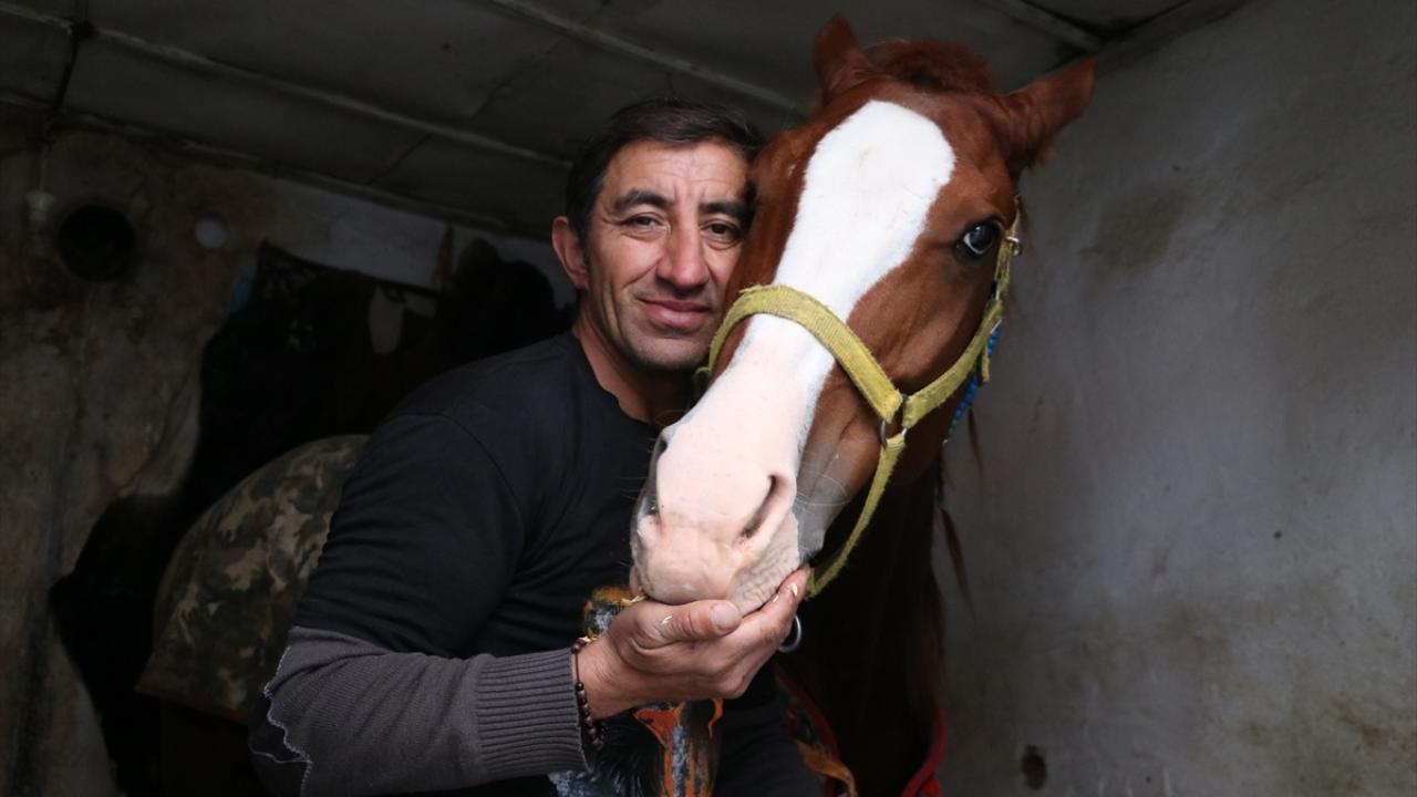 Çömez, evinin ahırında baktığı atının beslenmesini özenle yaparak güne başlıyor.