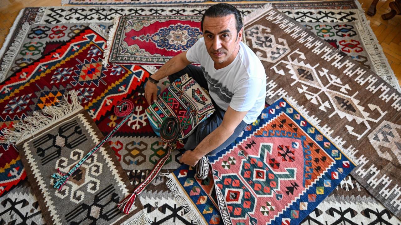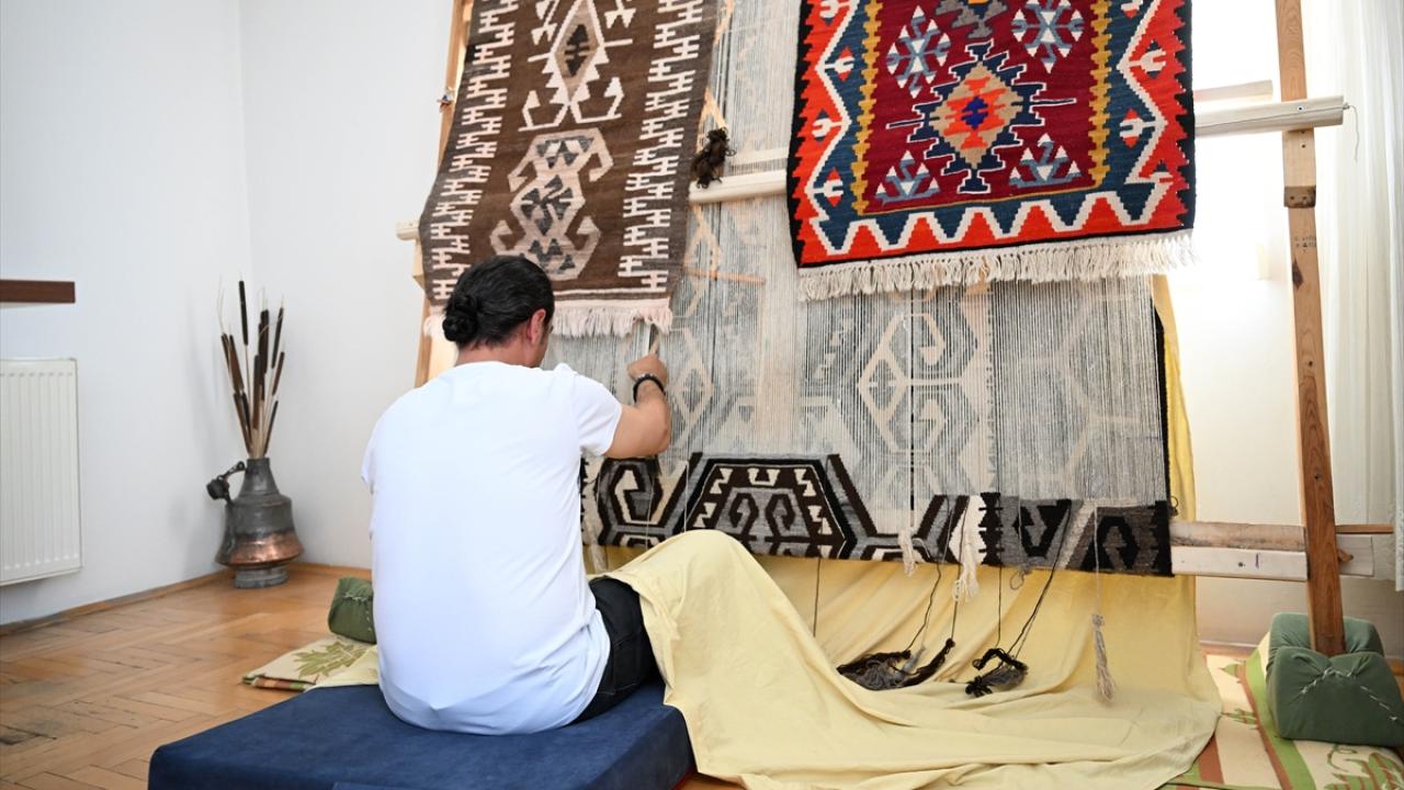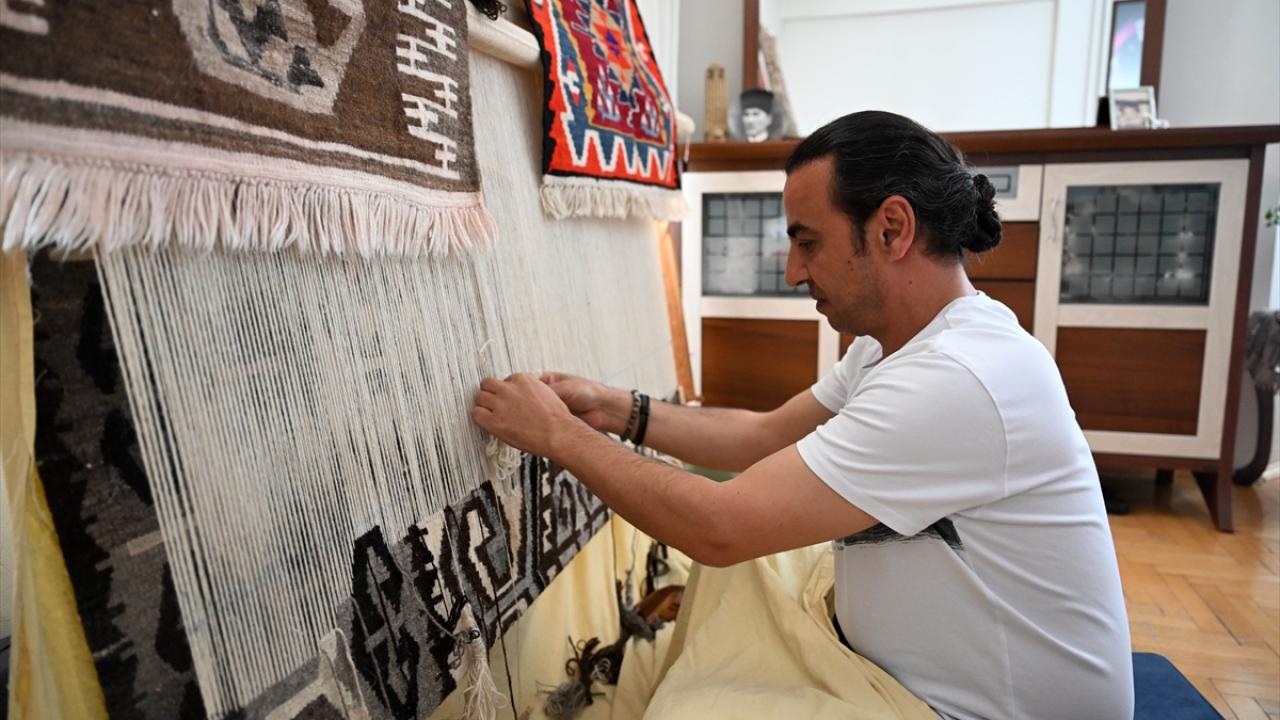 Kayseri'de edebiyat öğretmenliği yapan İsmail Solak, 7 yaşında annesinden öğrendiği ve tutkuyla bağlandığı dokumacılığı evine kurduğu kilim tezgahında sürdürüyor.