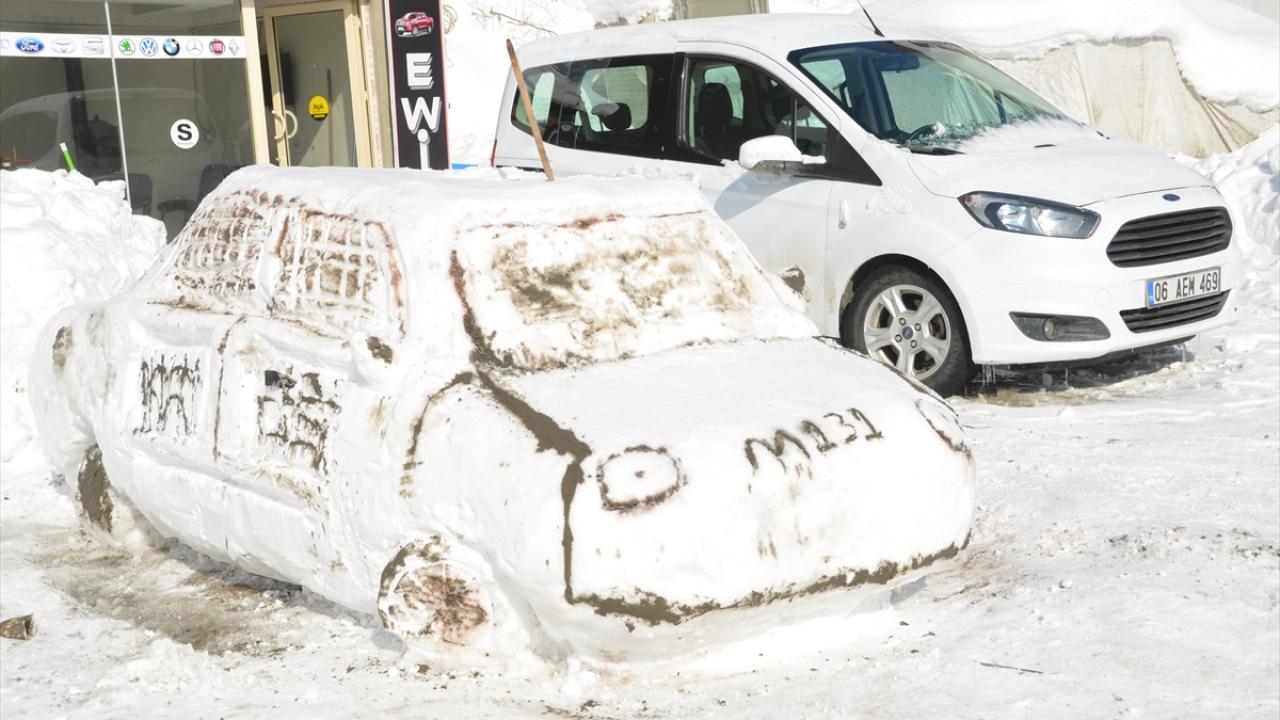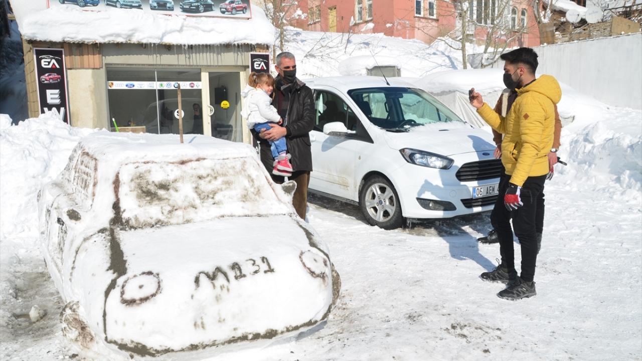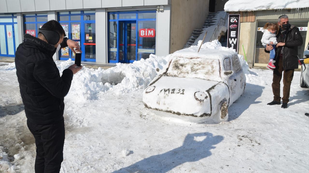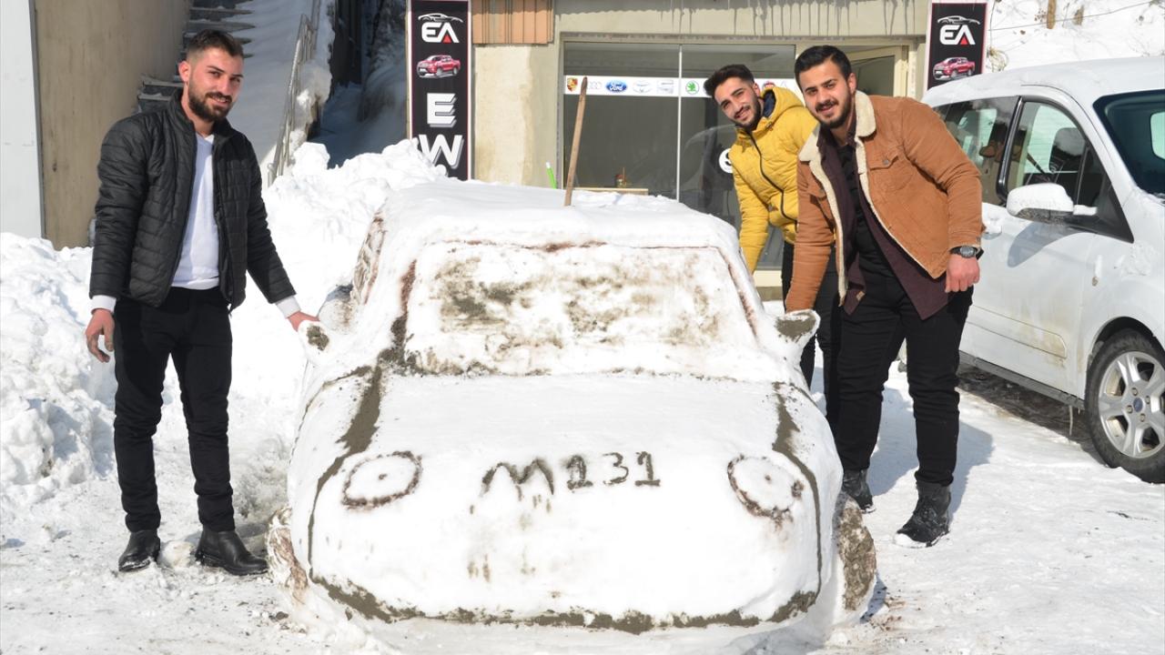 Yüksekova ilçesinde kar yağışının ardından esnaf, kardan "Murat 131" marka araç yaptı.