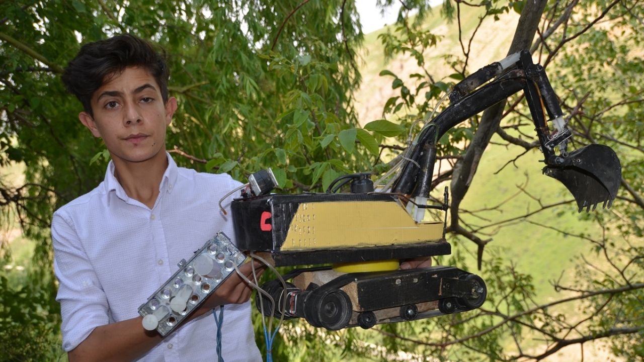 Hakkari'nin Yüksekova ilçesinde 17 yaşındaki Şahin Atilla, geri dönüşüm malzemelerinden iş makinesi maketi yaptı.