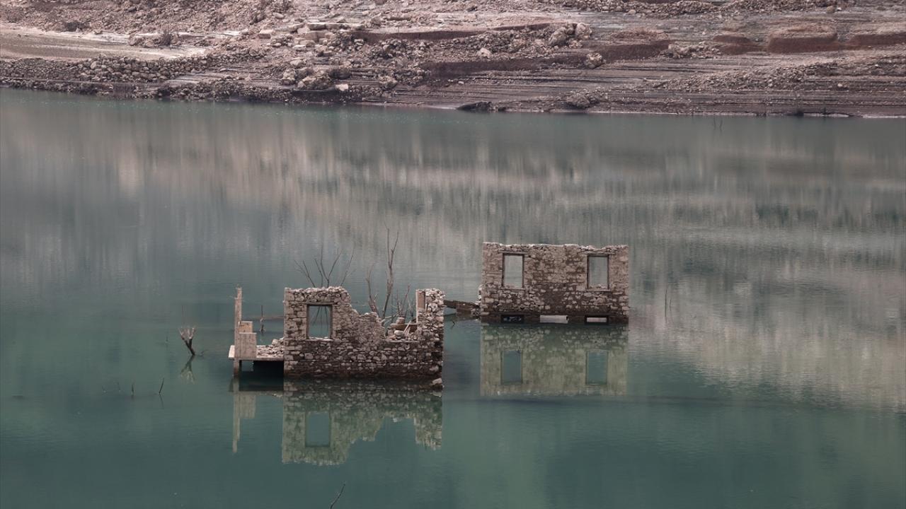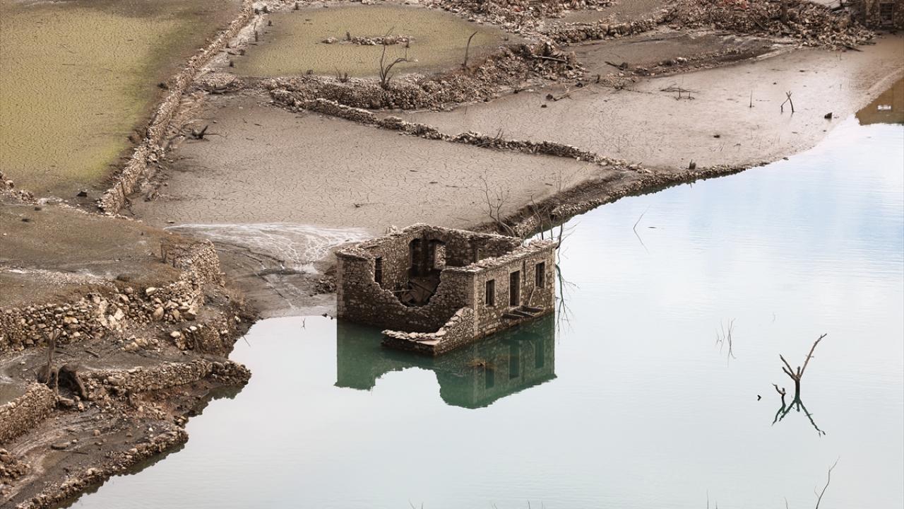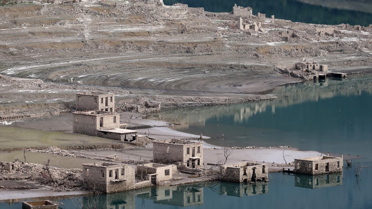 Suyu azalan gölde, eskiden su altında kalan köyün büyük bölümü yeniden gün yüzüne çıktı
