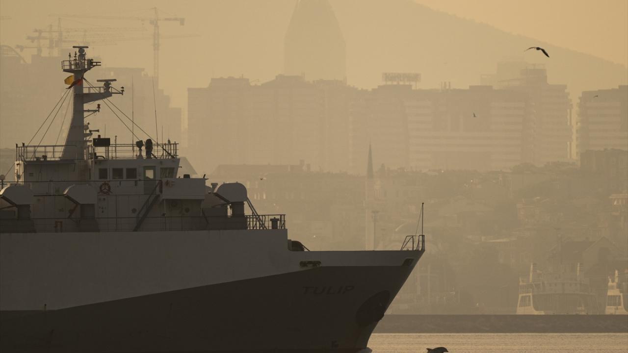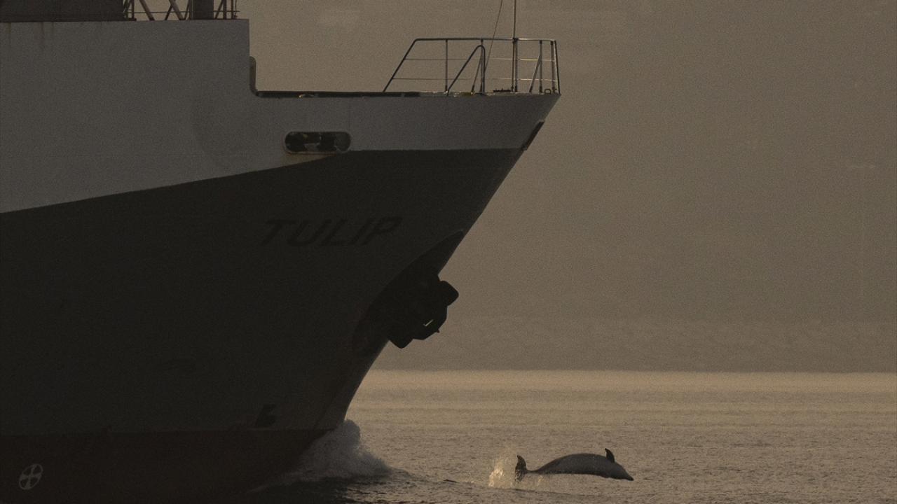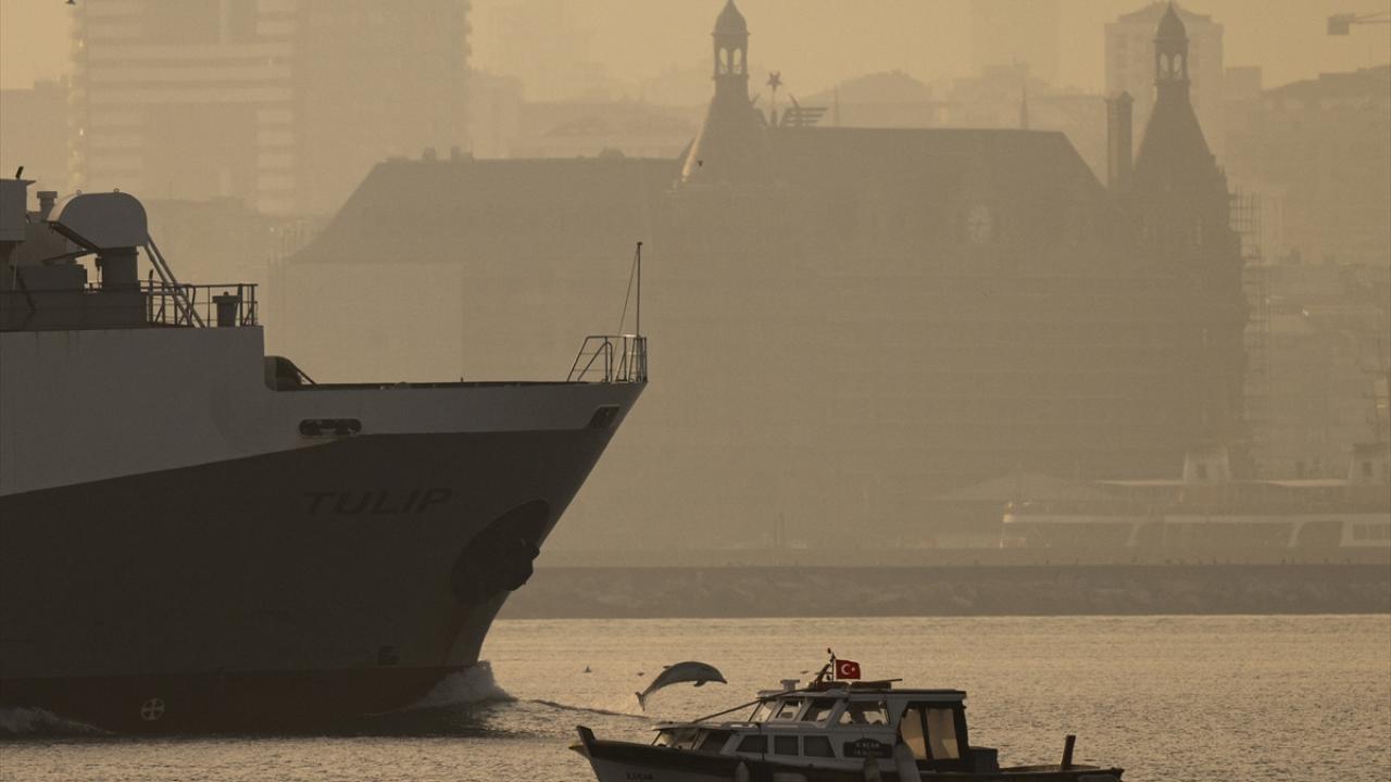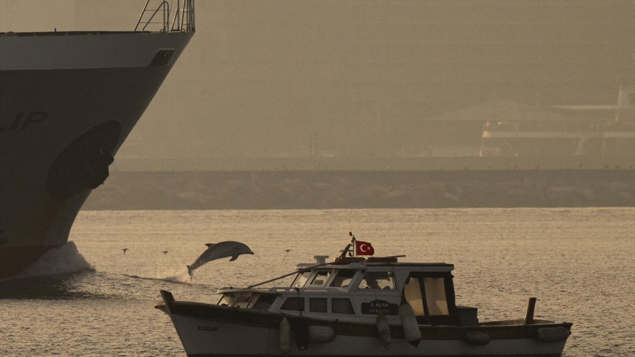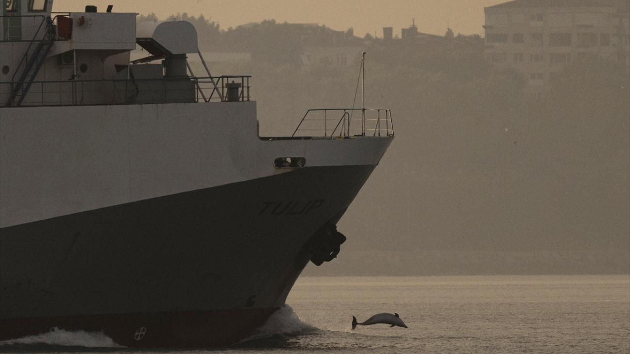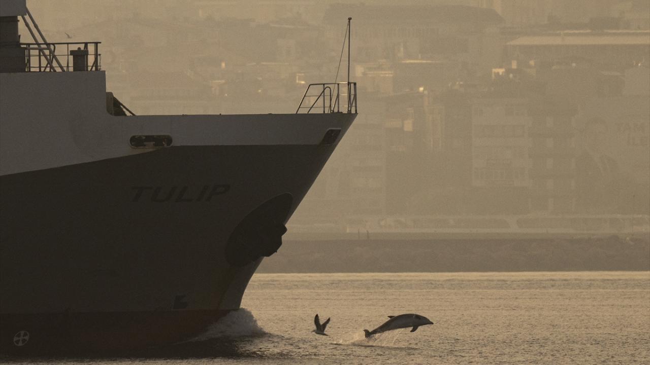 Sabah saatlerinde İstanbul Boğazı'ndan geçen gemilere eşlik eden yunuslar, Sarayburnu'ndan görüntülendi.