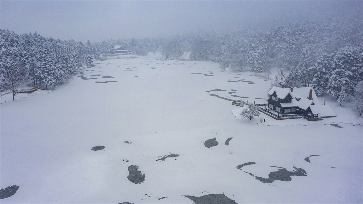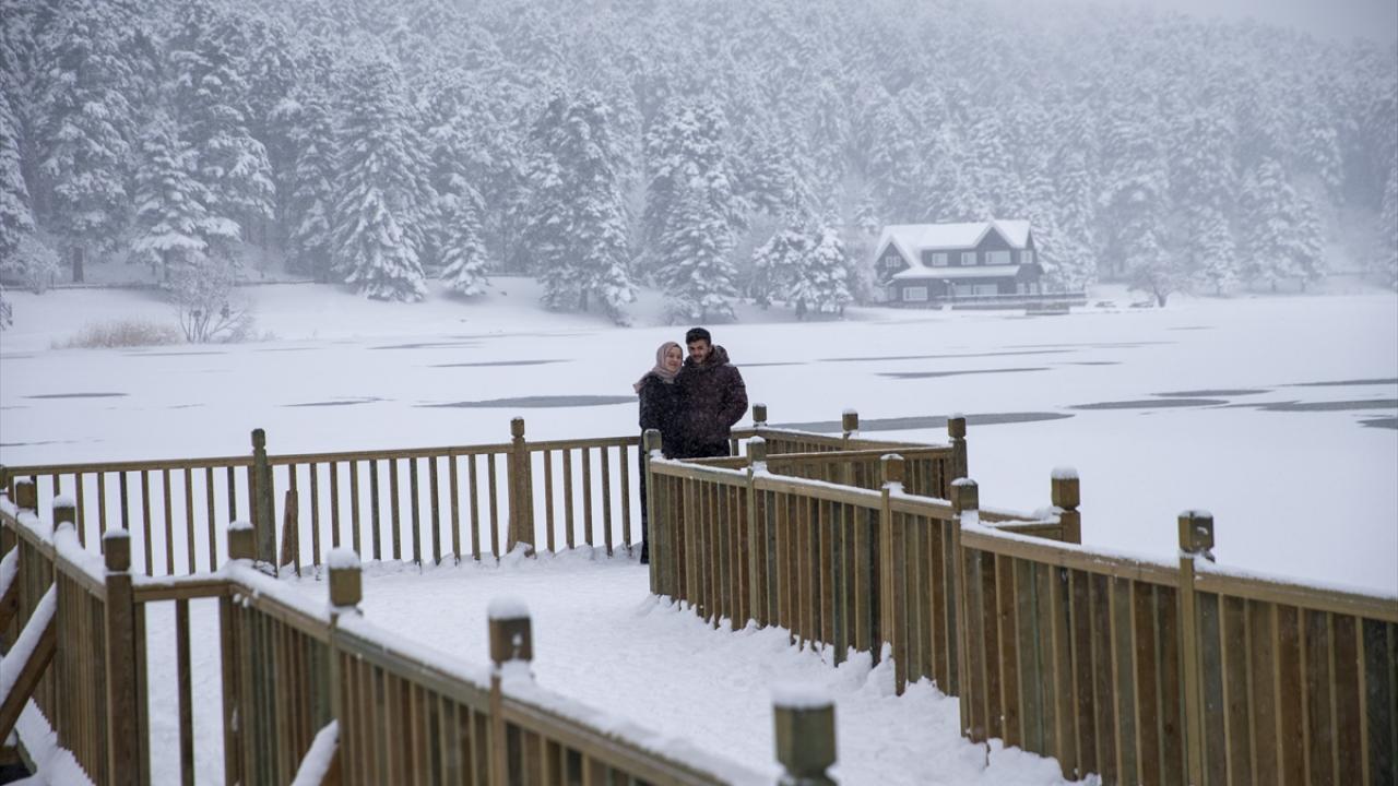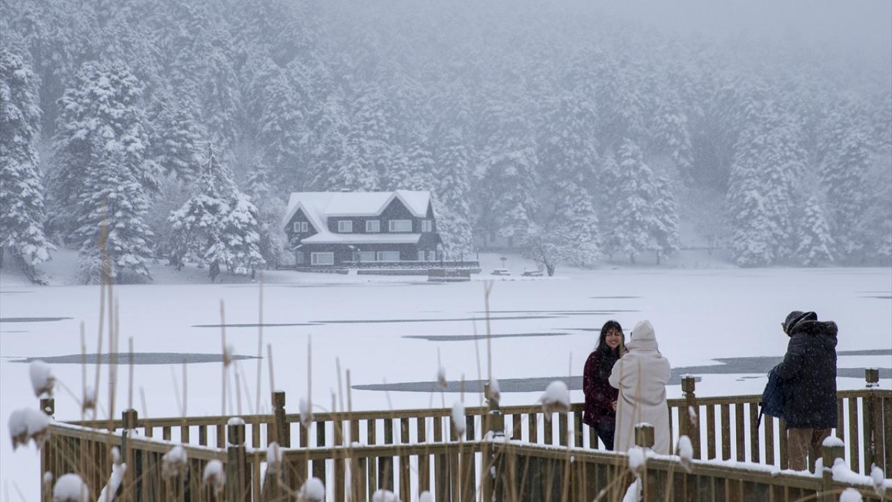 Bolu`nun doğal güzellikleriyle ünlü Gölcük Tabiat Parkı kar yağışının ardından beyaza büründü.