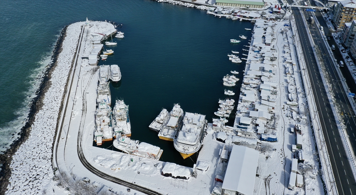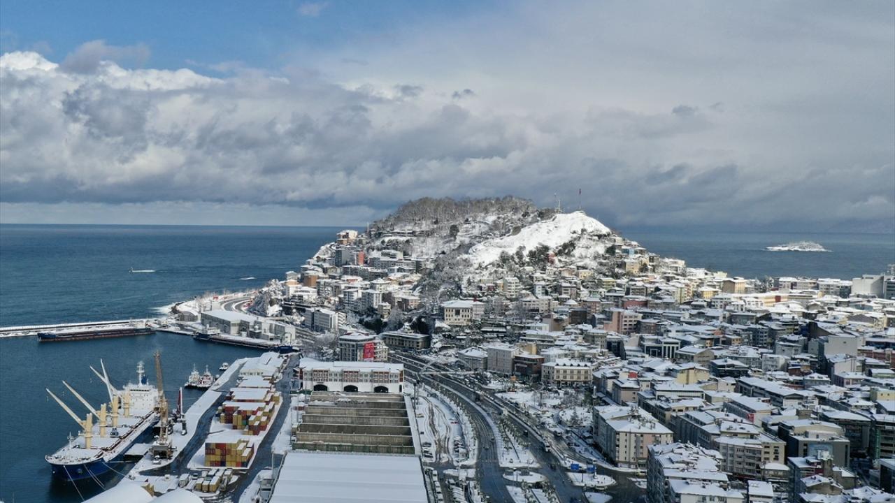 Giresun`da etkili olan kar yağışıyla kent merkezi beyaza büründü.