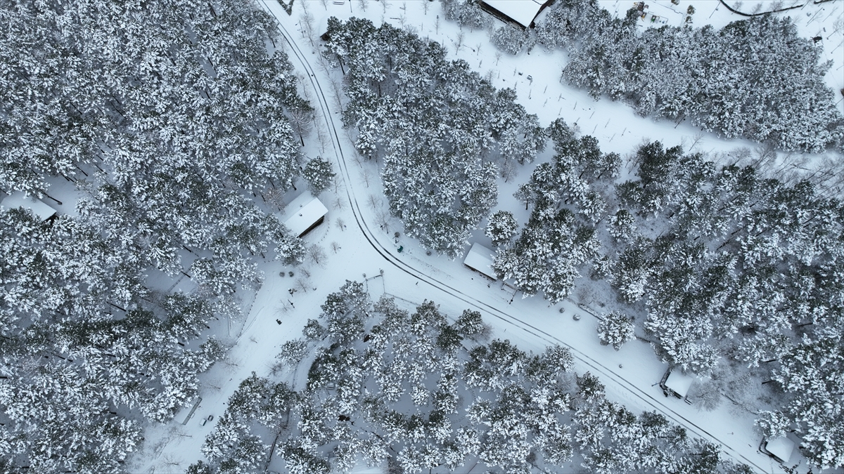 Gölcük Tabiat Parkı`ndaki kar manzarası dronla görüntülendi